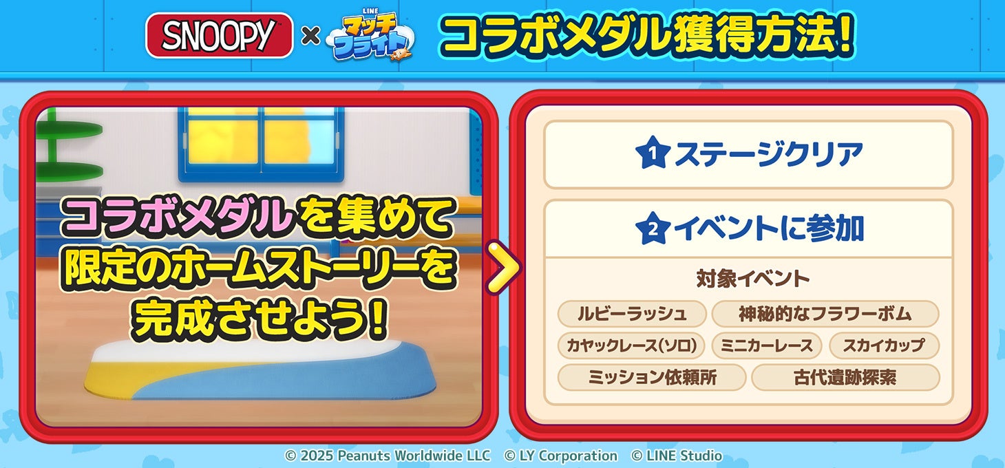 期間中、ステージをクリアするなど、各イベントの報酬でコラボメダルを集めると、デコショップからコラボデコを交換することができます。8種類のコラボデコを全て揃えると、コラボオリジナルホームストーリーが完成します。