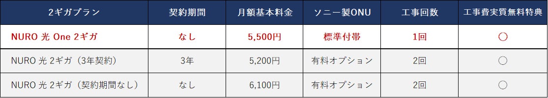 ・NURO 光 One 2ギガ : 月額基本料金5,500円(契約期間なし)