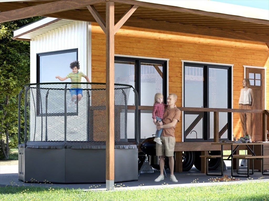屋外トランポリン付きの「ヤッホーテラス」は、エリアの山側に位置しています。自然に囲まれた空間の中、子供たちが思う存分楽しめる専用トランポリンと、焚火台付きの広々としたテラスが特徴です。夜には星空を眺めながら、ゆったりとした落ち着いた時間を満喫できます。