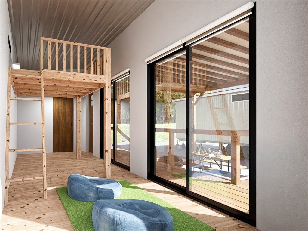 いずれのコテージも内装は木のぬくもりを感じられ、子供も楽しめるロフト付きで、あたかも秘密基地のような趣です。冷暖房、キッチンやトイレ・シャワーを完備しています。オーニング付き屋外スペースには、BBQグリル、焚火台、屋外シンクを備え、季節や天候を問わず快適に過ごすことができます。
