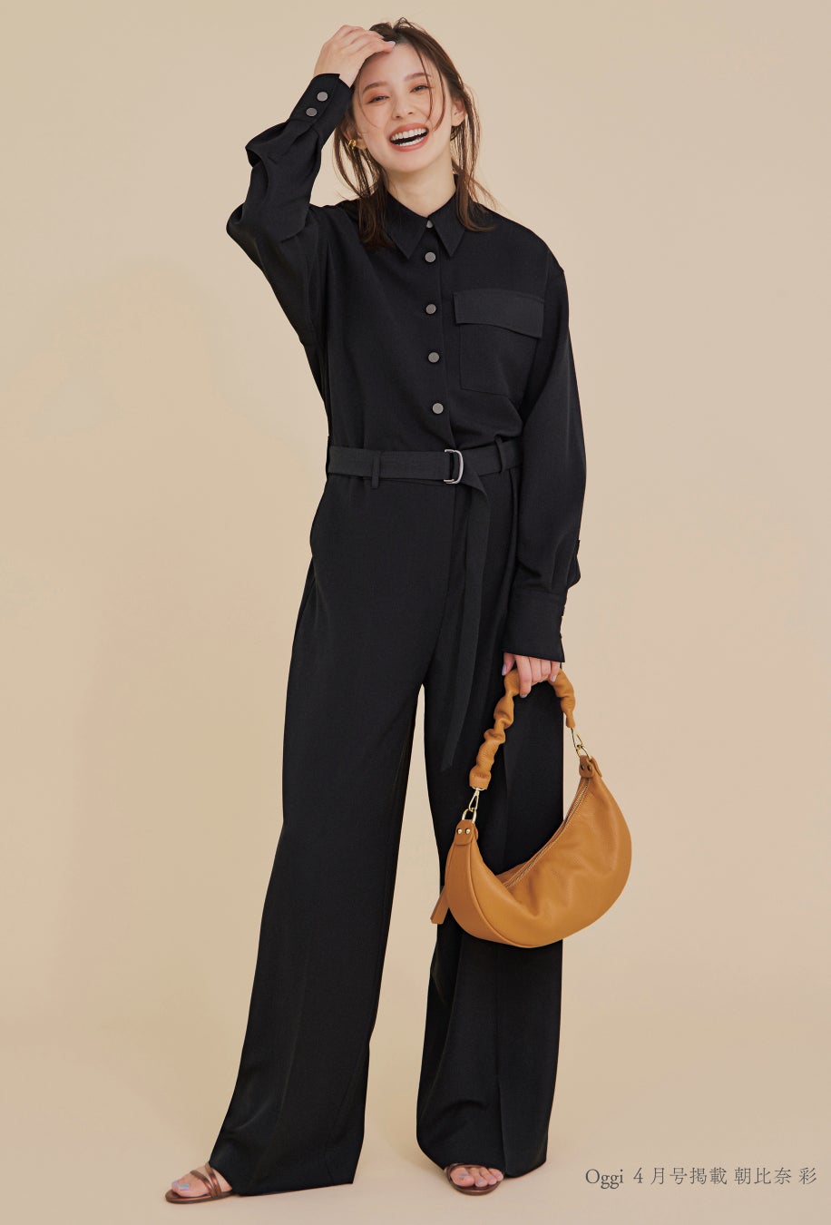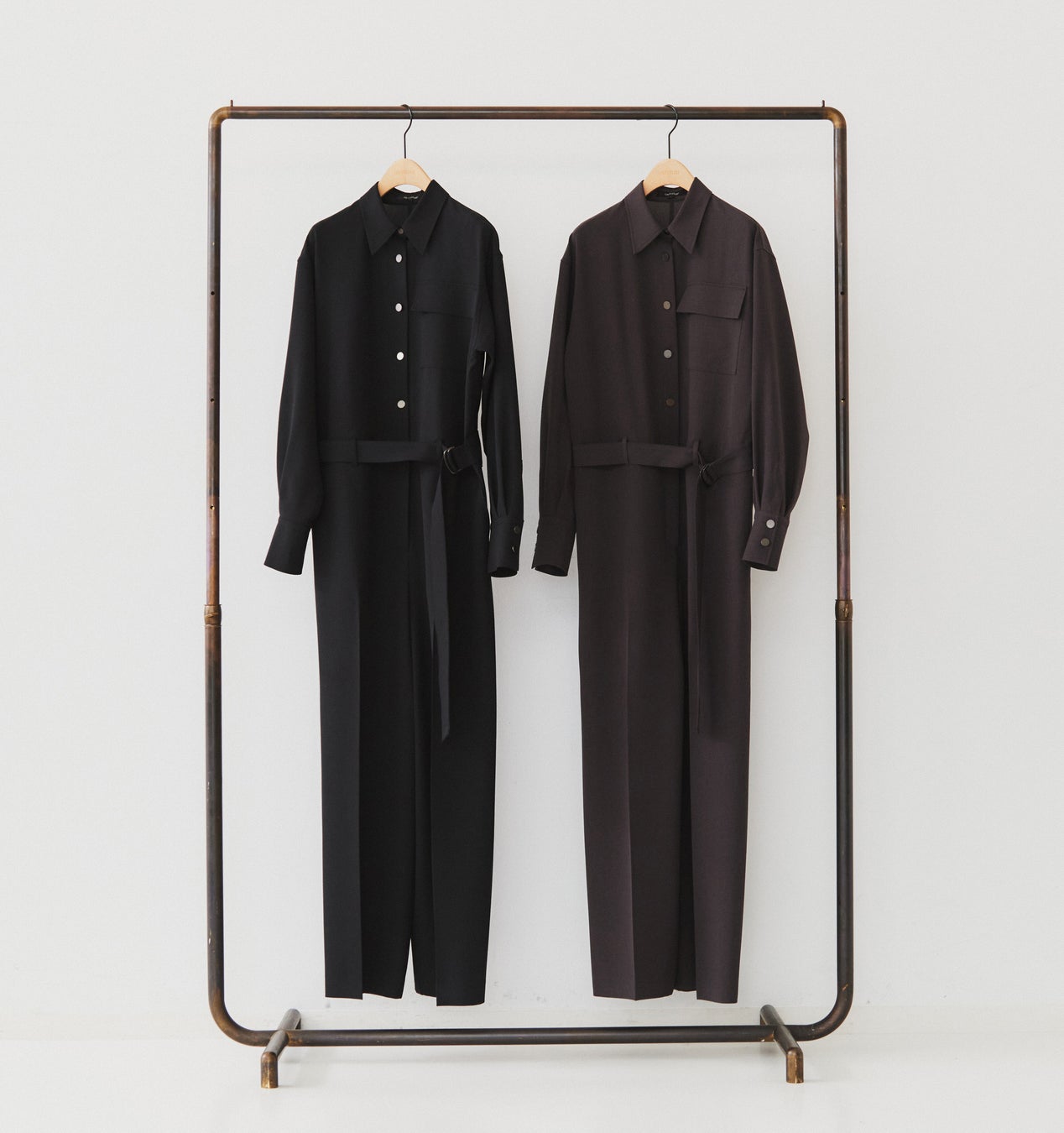 大人の上品さ漂うシンプルでハンサムなオールインワン。高級感のあるメタルボタンや印象的な胸ポケット、共布ベルトでサイズ調整が可能。ウエストのゴムや伸縮性のある素材でストレスフリーな着心地を実現し、適度な清涼感と高級感を持つ一着です。
