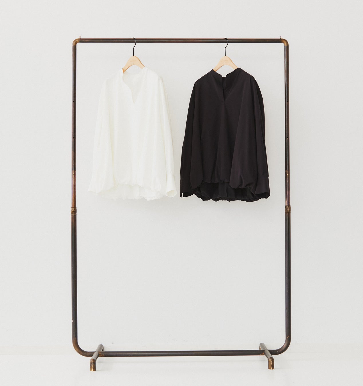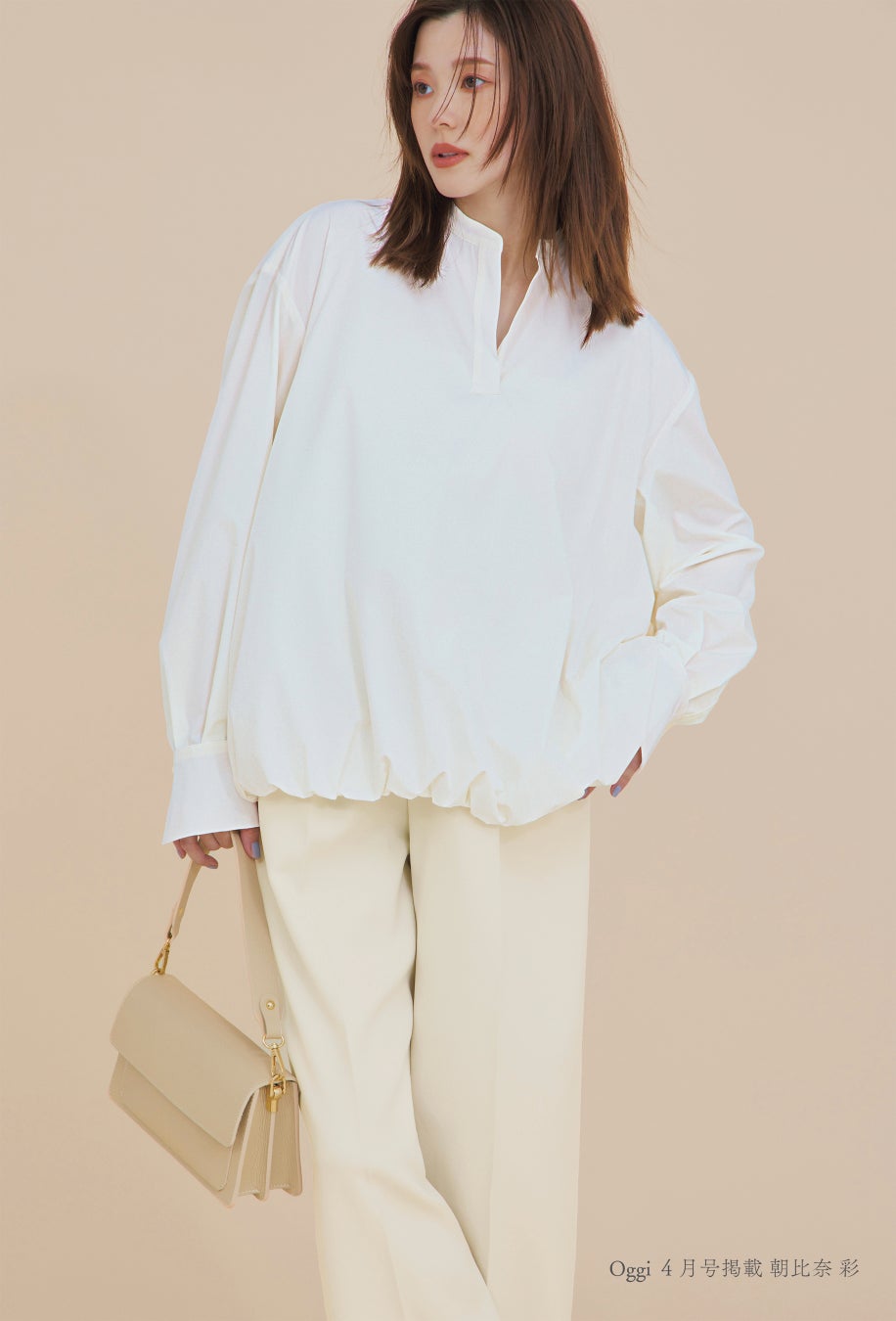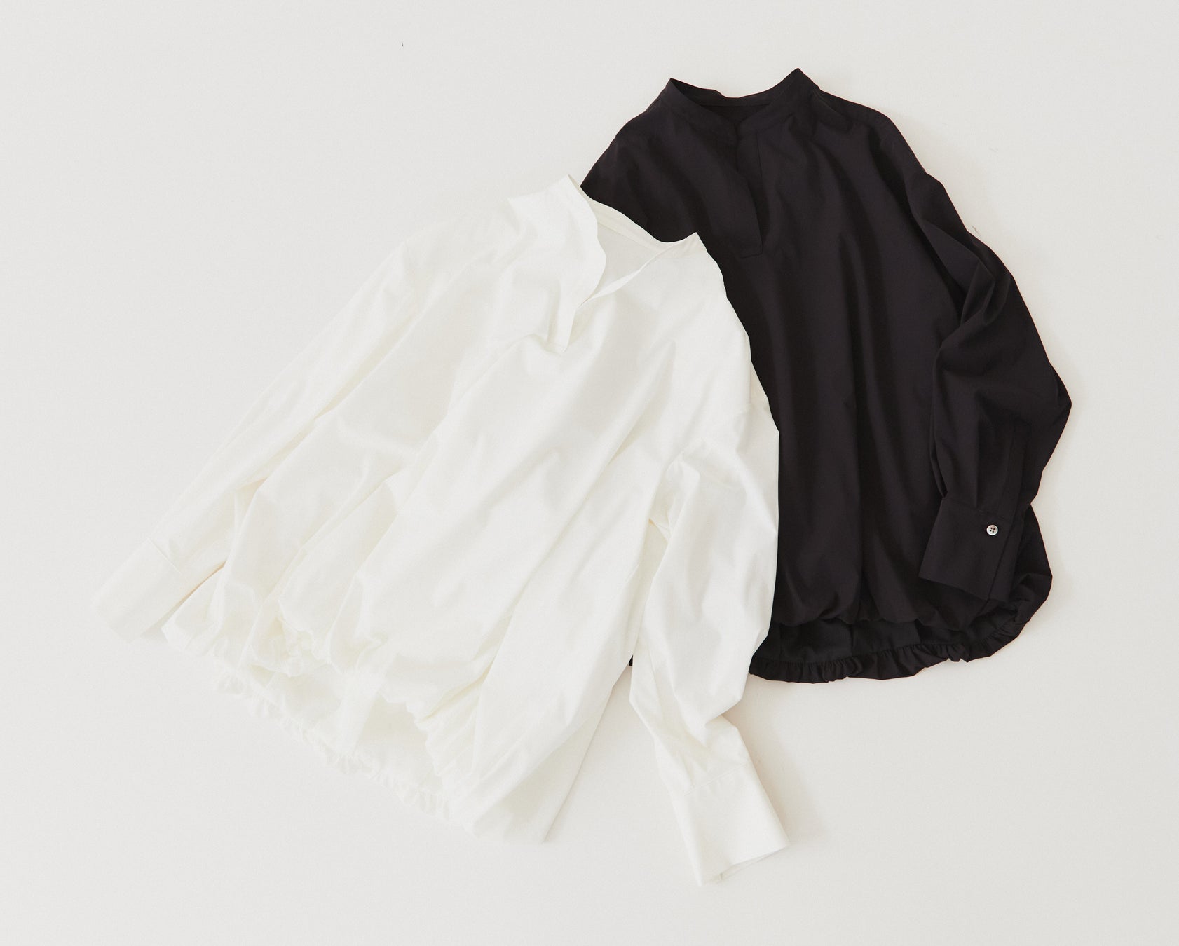 大人の抜け感を演出するスキッパー襟とバルーンヘムのブラウス。絶妙なボリューム感で、前後差のある着丈が気になる部分をカバーします。しなやかなナイロン素材は2WAYストレッチと撥水機能を備え、洗濯機で洗えるため普段使いに便利です。