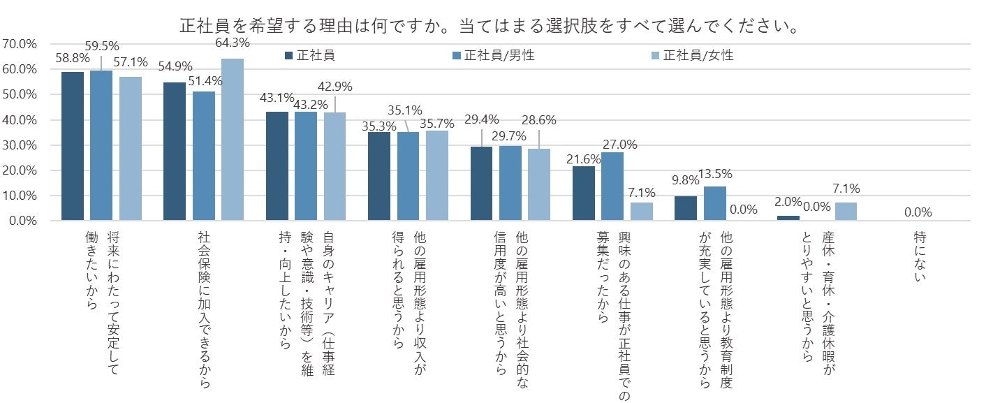 一方、「女性」のほうが「男性」よりも「社会保険に加入できるから」が12.9pt、「産休・育休・介護休暇がとりやすいと思うから」が7.1pt高くなった。特に社会保険については6割超の人が正社員を希望する理由として挙げており、働くうえで重視していることがうかがえる。