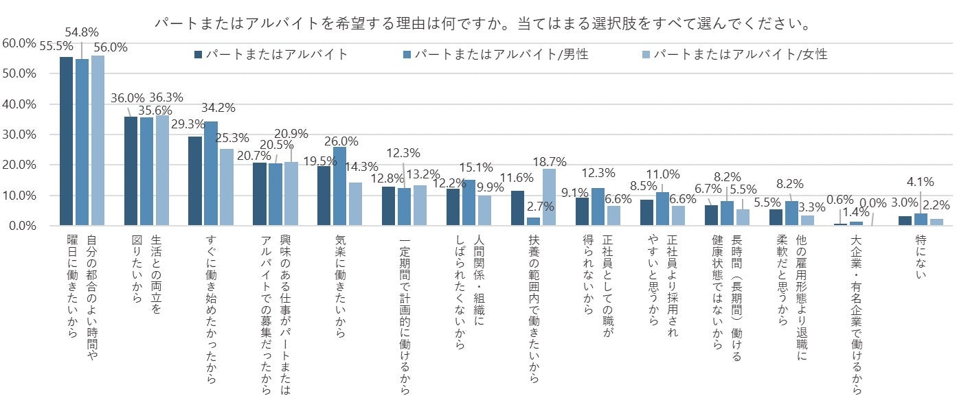 求人に応募した、パートまたはアルバイトを希望する人に、なぜその雇用形態を希望するのかをきいた(複数回答)。最も多かったのは「自分の都合のよい時間や曜日に働きたいから」で55.5%、次いで「生活との両立を図りたいから」が36.0%、「すぐに働き始めたかったから」が29.3%となった。