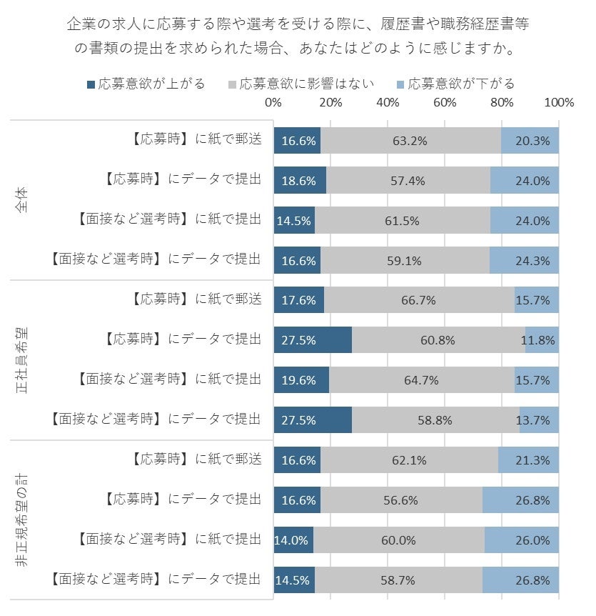 「正社員」を希望している人では、提出時期にかかわらず、「データで提出」の時に27.5%の人が「応募意欲が上がる」と回答