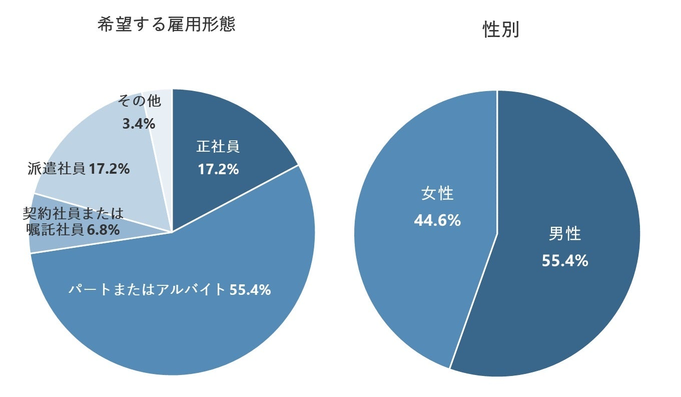 一方、「女性」のほうが「男性」よりも「扶養の範囲内で働きたいから」が16.0pt高くなった。家庭の収入を確保しつつ手取りも減らさないで働ける仕事が多いパート・アルバイトを希望しているようだ。