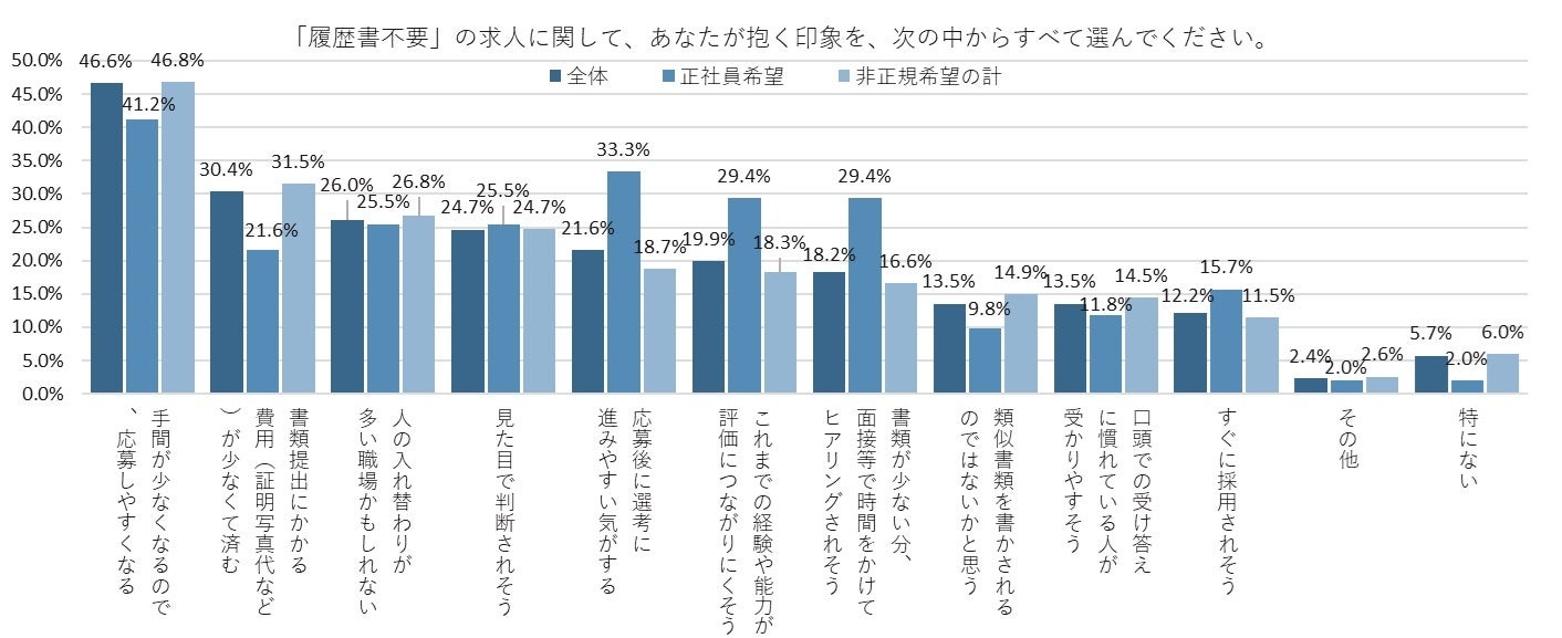 希望の雇用形態別にみると、「正社員」を希望する人では、「応募後に選考に進みやすい気がする」(33.3%)という意見も多いが、「これまでの経験や能力が評価につながりにくそう」(29.4%)、「書類が少ない分、面接等で時間をかけてヒアリングされそう」(29.4%)という意見もあり、選考で本来の自分がしっかりアピールできるのかを危惧している様子もうかがえる。「非正規希望の計」では、「手間が少なくなるので、応募しやすくなる」(46.8%)や「書類提出にかかる費用が少なくて済む」(31.5%)が「正社員希望」よりも多かった。「すぐに採用されそう」(11.5%)という意見は少なく、あくまで応募までのハードルを低くする1つの手段としてとらえられているようだ。