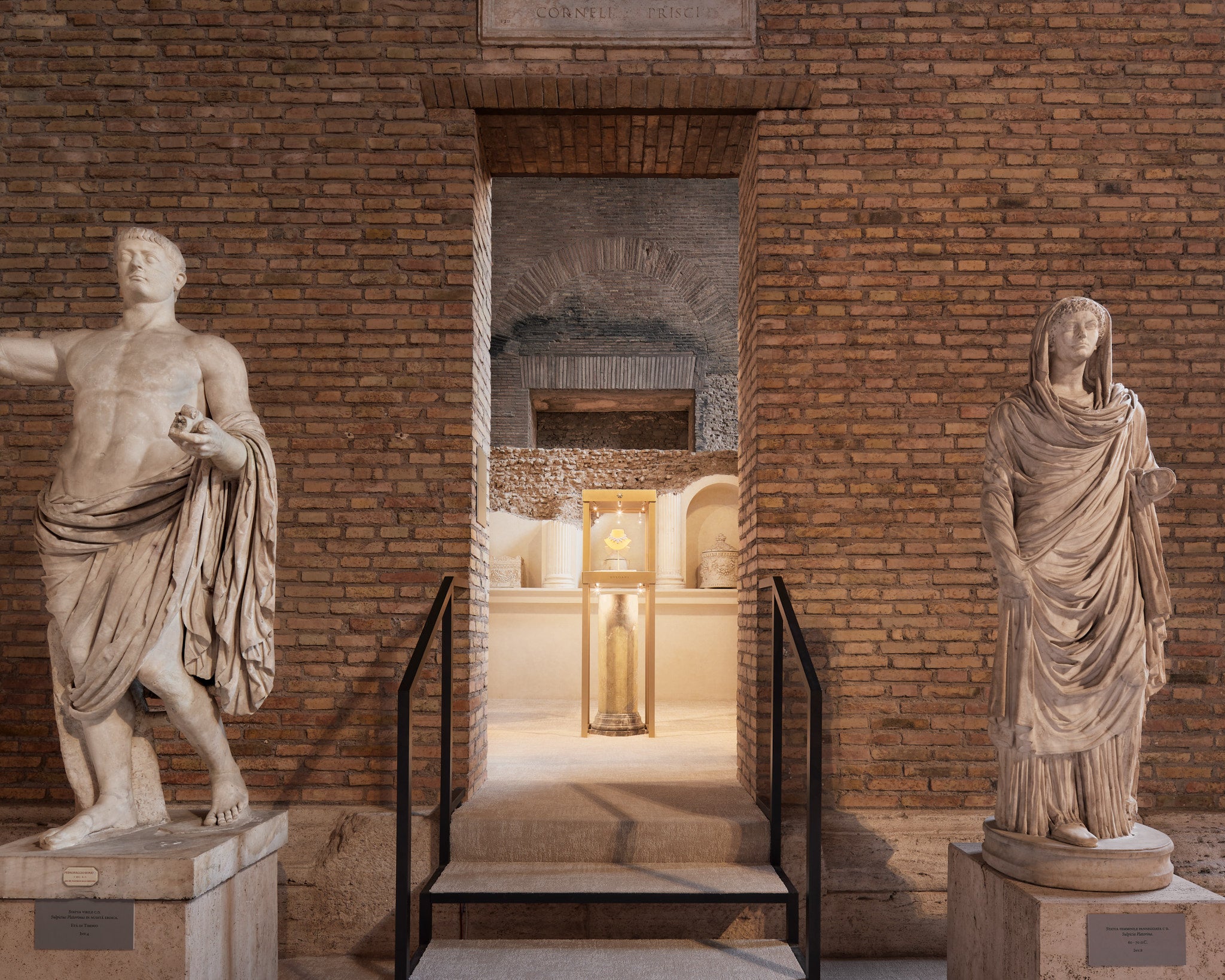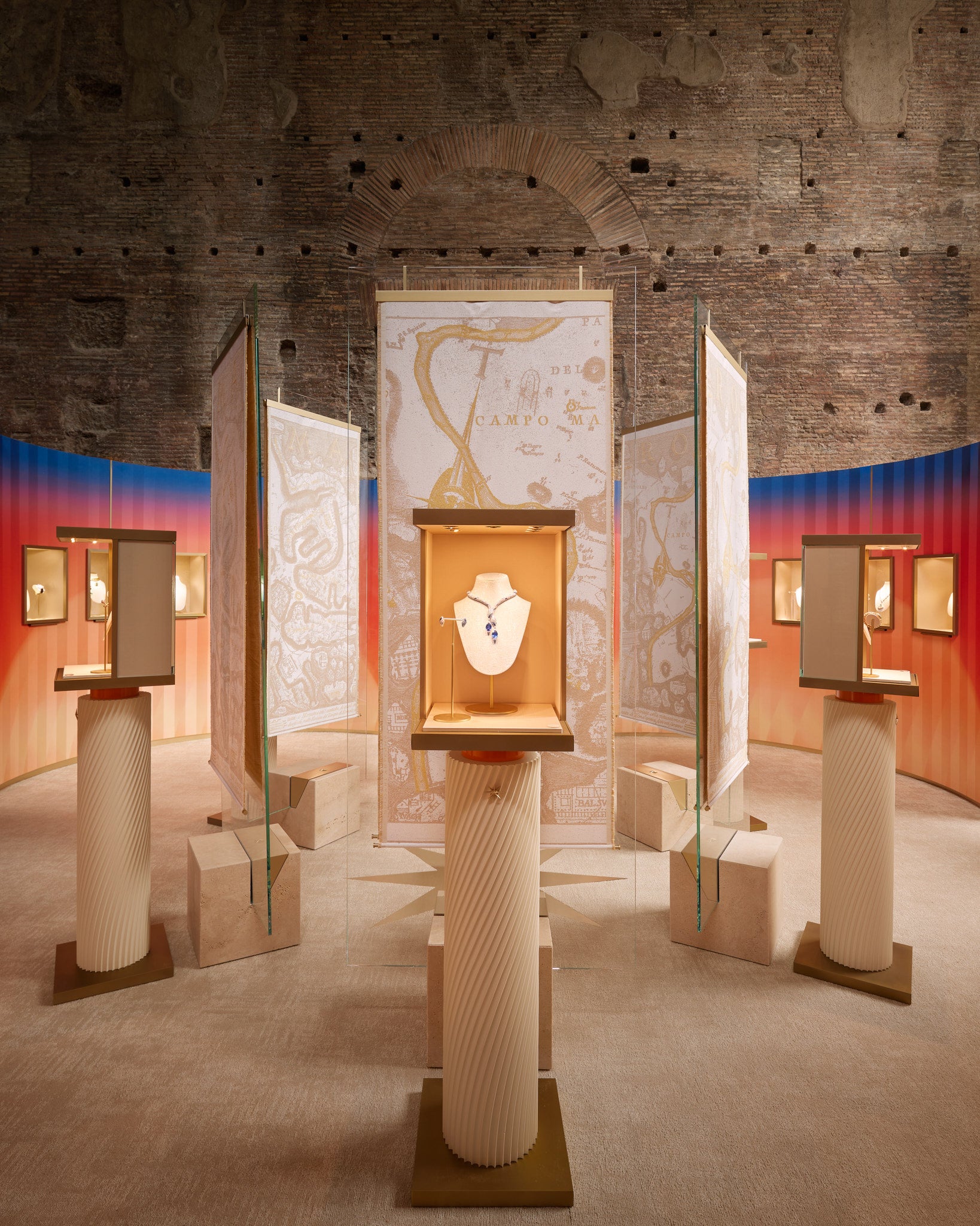 新作「エテルナ」の主要作品の数々は、イタリアの建築家リナ・ボ・バルディにインスパイアされたディスプレイと、歴史あるヴェネツィアの織物メーカー、ルベッリによる高密度のジャカード技法で実現した、画家であり建築家のジョヴァンニ・バッティスタ・ピラネージの版画を見事に再解釈した貴重な特注タペストリーと共に披露されました。この版画は、テルメ・ディ・ディオクレツィアーノのアンティーク見取り図と、ピラネージが1756年に出版した『Antichità Romane』に収めた、セプティミウス・セウェルス時代(紀元203年から211年)の大理石の板に刻まれたローマの古地図「Forma Urbis Severiana」の複製で、ローマの歴史的遺産とイタリアの芸術、職人技、技術を称える傑作であり、ブルガリ、Istituto Centrale per la Grafica、そしてルベッリのコラボレーションによって実現しました。