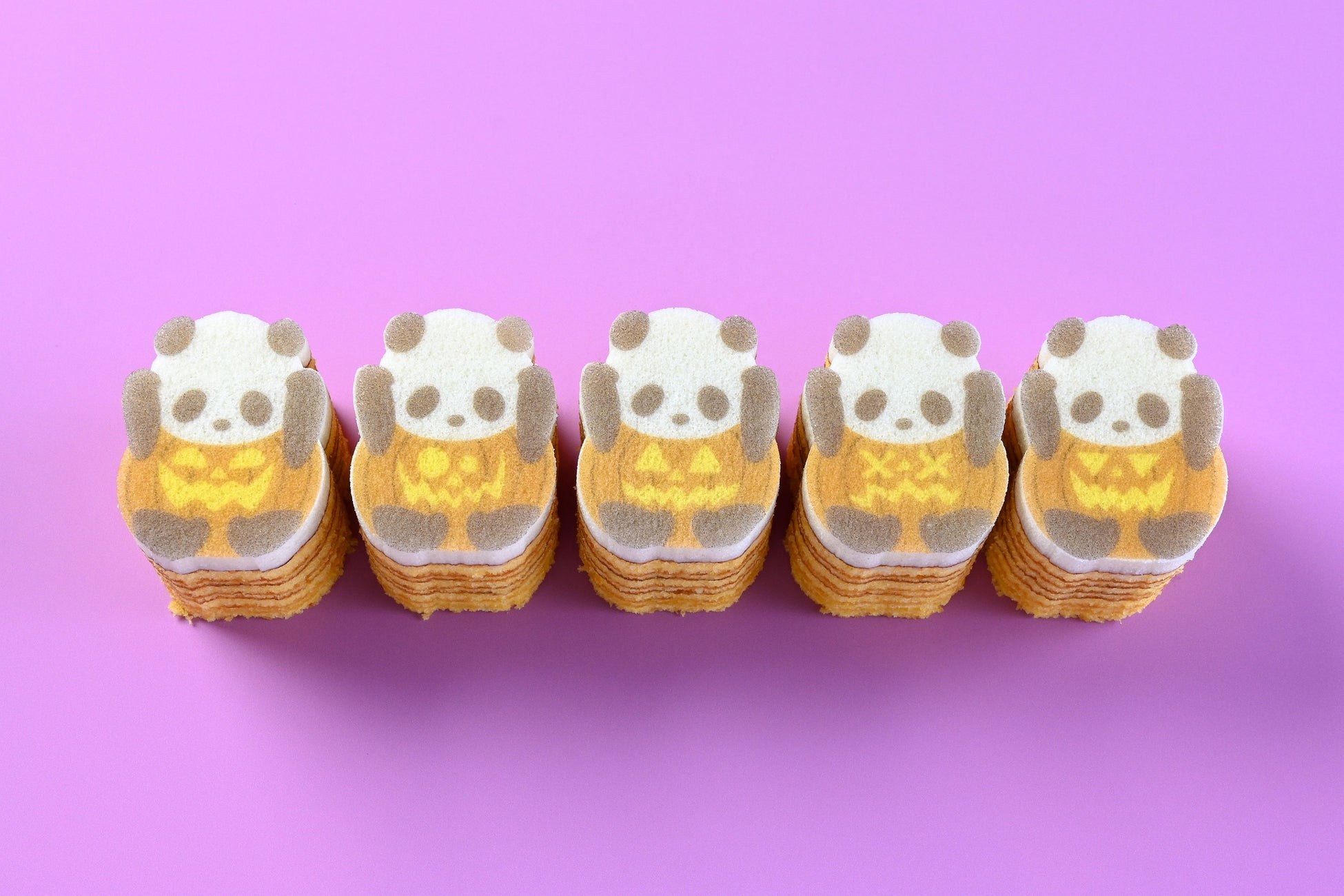 型ぬきして食べるパンダ型のバウムクーヘン。かぼちゃの顔が5種類ランダムで入った特別仕様。