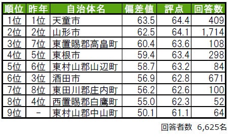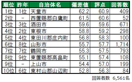 1位は、2年連続で天童市です。2位は初登場の西置賜郡白鷹町で、昨年は累計回答者数が50名未満でランキングの集計対象外でした。3位は、2年連続で酒田市です。その他トップ10内では、昨年は偏差値50未満のため順位非公開だった上山市が9位にランクインしています。