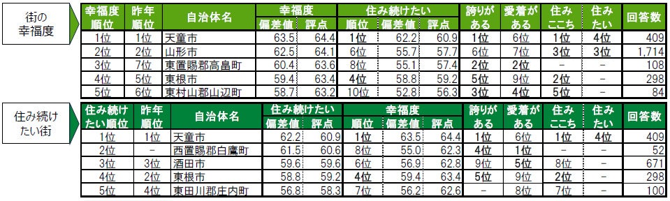 街の幸福度は2年連続で、1位天童市、2位山形市。3位は昨年7位から順位を上げた東置賜郡高畠町。