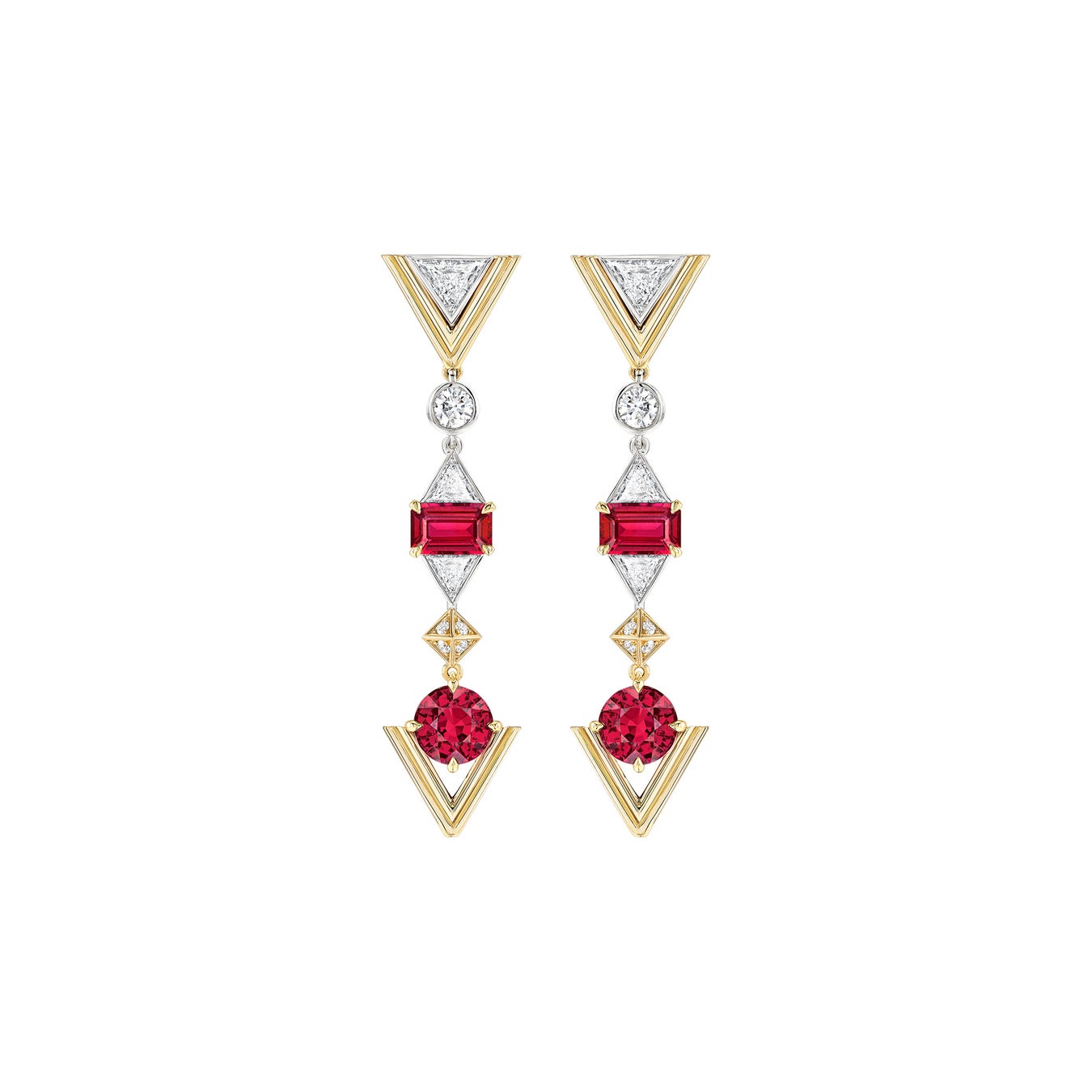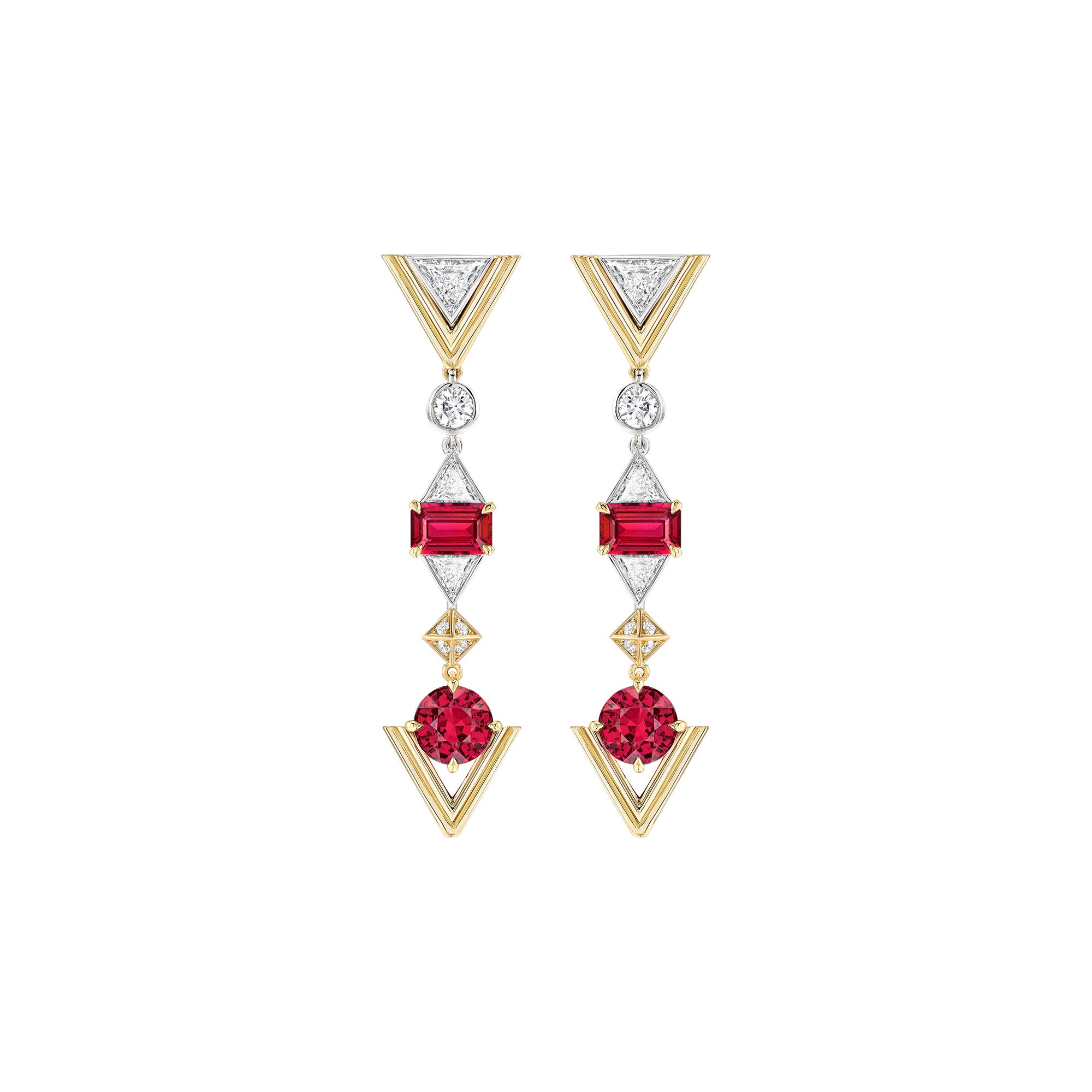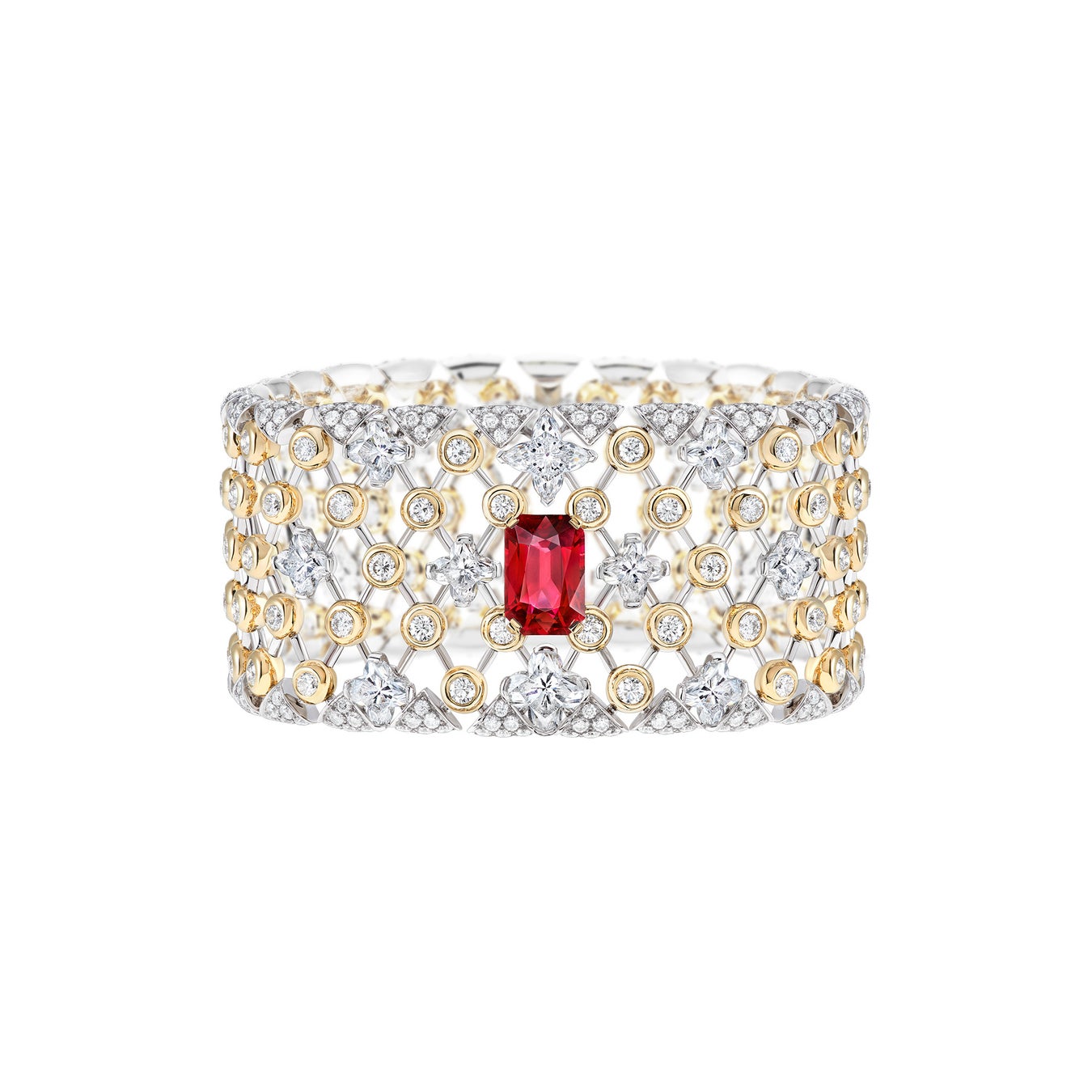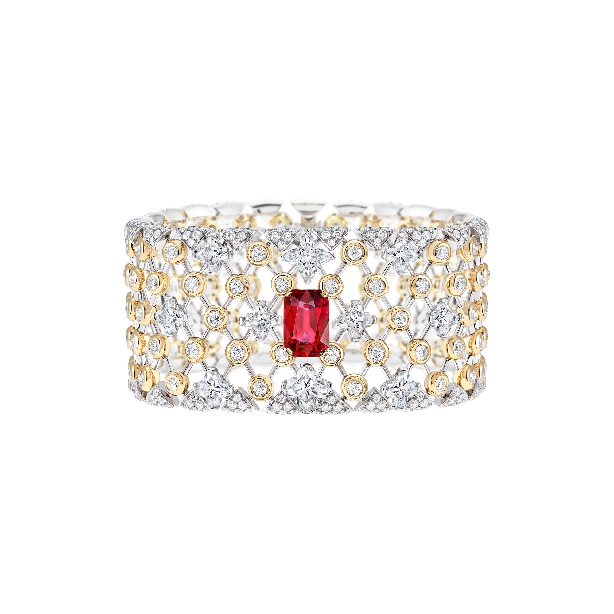 また、ルイ·ヴィトンのハイジュエリーコレクション「スピリット」のテーマのひとつ「デスティニー」から、プラチナ、イエローゴールド、4.05カラットのルビー、9粒のLV モノグラムフラワーカットダイヤモンド、LV モノグラムスターカットダイヤモンドとダイヤモンドをちりばめたブレスレットと、イエローゴールドとプラチナ、1.32カラットと1.29カラットの2粒のラウンドカットルビー、各1.22カラットの2粒のエメラルドカットルビーとダイヤモンドをあしらったイヤリングを着用しました。