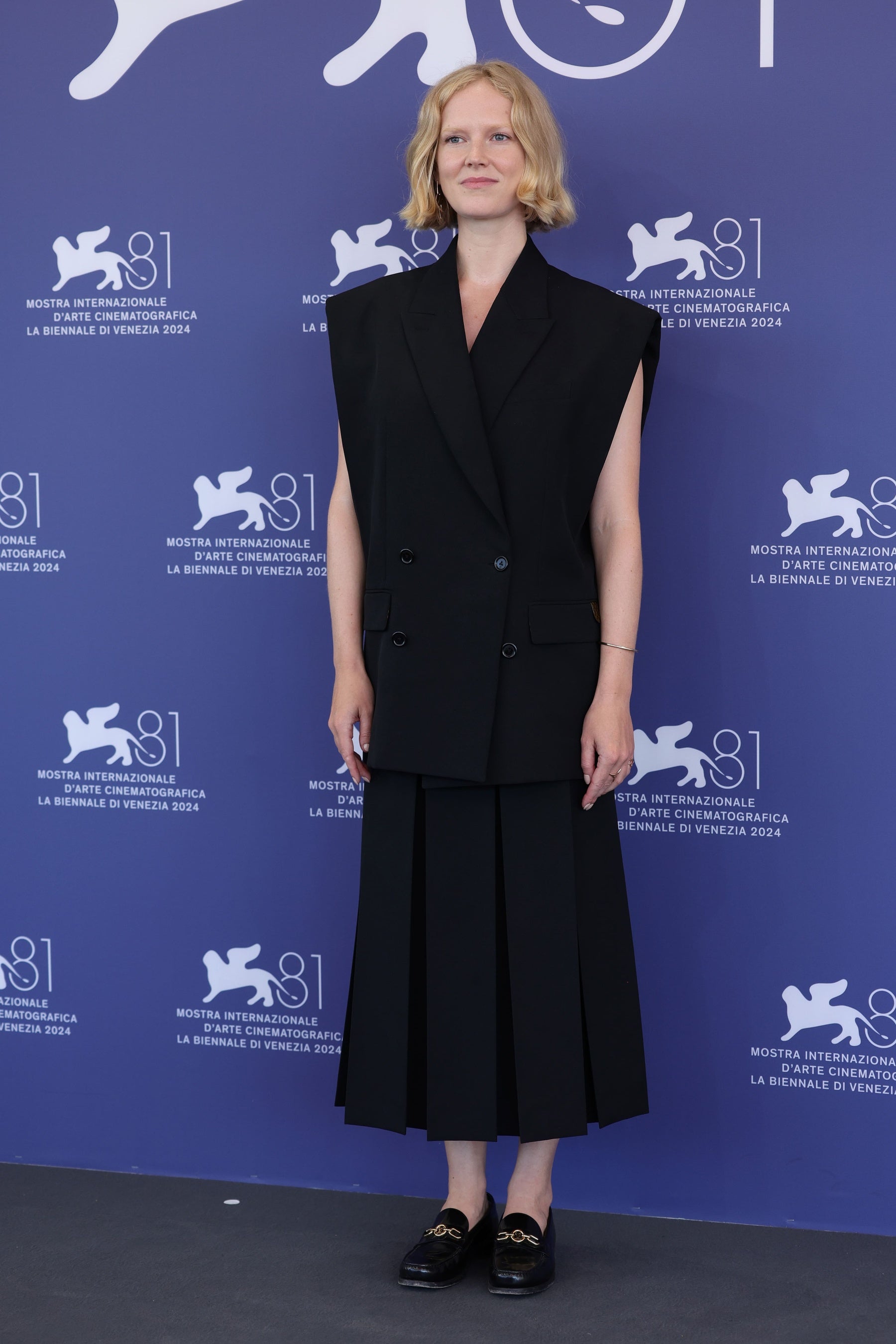 また、映画「Harvest(原題)」のフォトコールではブラックのノースリーブダブルブレストジャケットとプリーツスカートにブラックのレザーローファーを合わせてました。