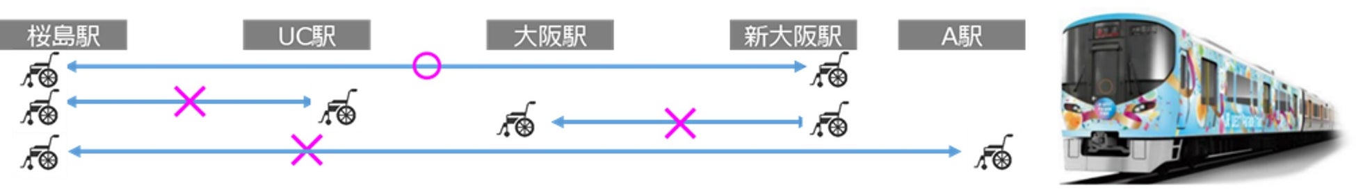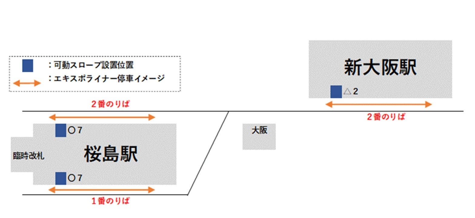 ・万博期間中に運行される臨時直通列車:エキスポライナーにご乗車のお客様で、新大阪・桜島両駅が発着のご旅行であれば、「乗り・降り」どちらの場面でも可動スロープが自動で段差・隙間を縮小(下図の通り、大阪や西九条の乗換場面は対象外)
