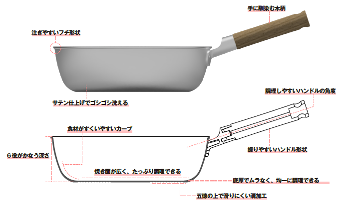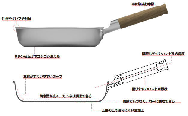 毎日使う基本の調理道具であるフライパンと包丁を見直すにあたり、料理を美味しく調理できることはもちろん、調理のしやすさや、お手入れの簡便さなども考えた構造や品揃えにしました。