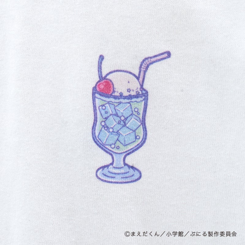 くすみカラーのバックプリントデザインで、日常使いしやすいTシャツです。胸元ワンポイントに、ぷにるの大好物、クリームソーダをあしらいました。ワンサイズ展開です。