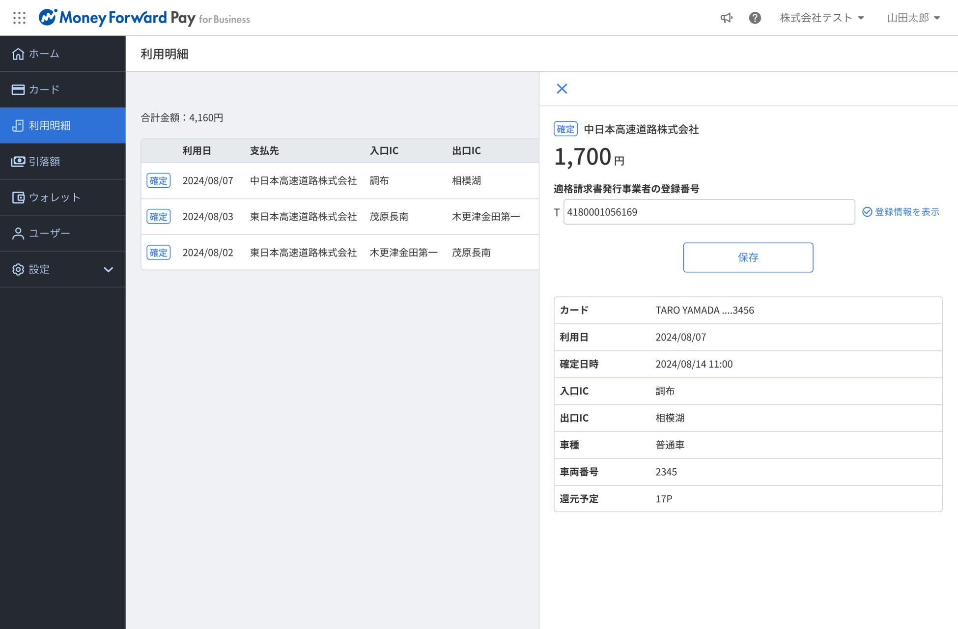 明細には利用日、料金所通過時刻、金額、道路事業者名、入口IC・出口ICなどの情報が含まれ、これらを『マネーフォワード クラウド』※3で一元管理できます。