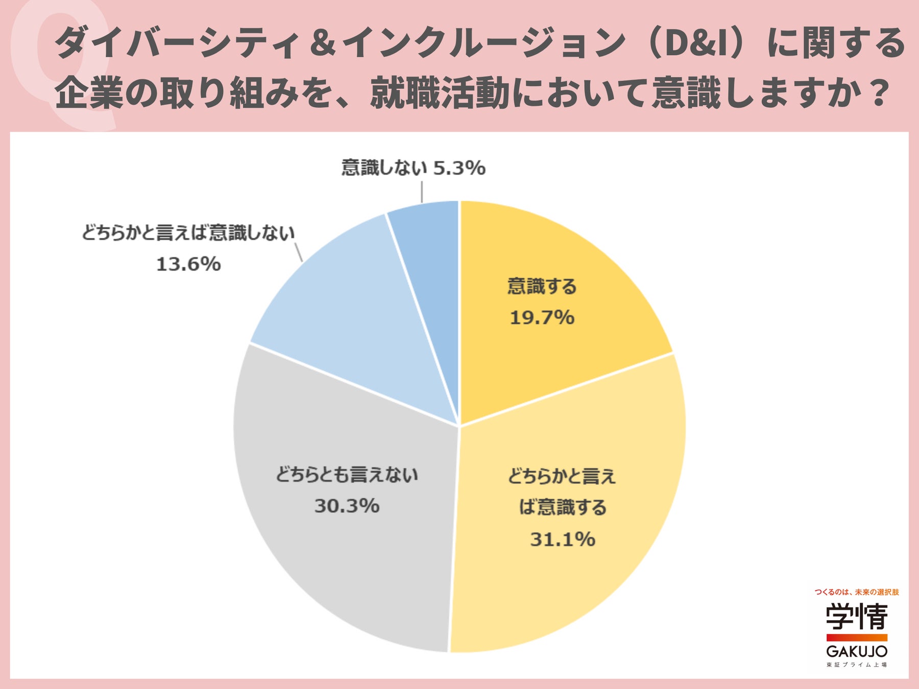 株式会社学情(本社:東京都中央区)は、2027年3月卒業(修了)予定の大学生・大学院生を対象に、「ダイバーシティ&インクルージョン(D&I)」についてインターネットアンケートを実施しました。D&Iを推進する企業に対し、4人中3人が「好感が持てる」と回答。就職活動でD&Iに関する企業の取り組みを意識すると答えた学生も半数を占めました。「多様性を推進している企業はとても働きやすい環境だと思う」「多様性を受け入れてくれる会社では、より生き生きと働くことができると思う」「変化する国際社会についていこうとしている」「企業の構成員が多様である方が新しい発見等が豊富だと思う」「様々な事情を抱えた人たちがそれぞれ輝けると思う」「多様性を推進する会社は差別等もなく良い」といった声が寄せられました。