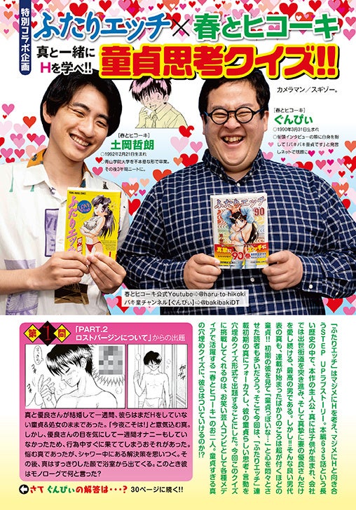 本編635話という長い歴史の中で、本作の主人公・真には子供が生まれ、会社では出世街道を突き進み、そして真摯に妻の優良さんだけを愛し続ける、最高の男である。しかし‼ そんな良い男代表の真も、連載が始まったばかりのころは超が付くほどの童貞‼ 初期の彼を見て「童貞っぽいな…」と心を悶々とさせた読者も多いだろう。そこで今回は、「ふたりエッチ」連載初期の真にフォーカスし、彼の童貞らしい思考・言動を穴埋めクイズ形式で出題することにした。今回このクイズに挑戦してくれるのは、お笑い芸人コンビとして各種メディアで活躍する「春とヒコーキ」ぐんぴぃ&土岡哲朗のお二人。