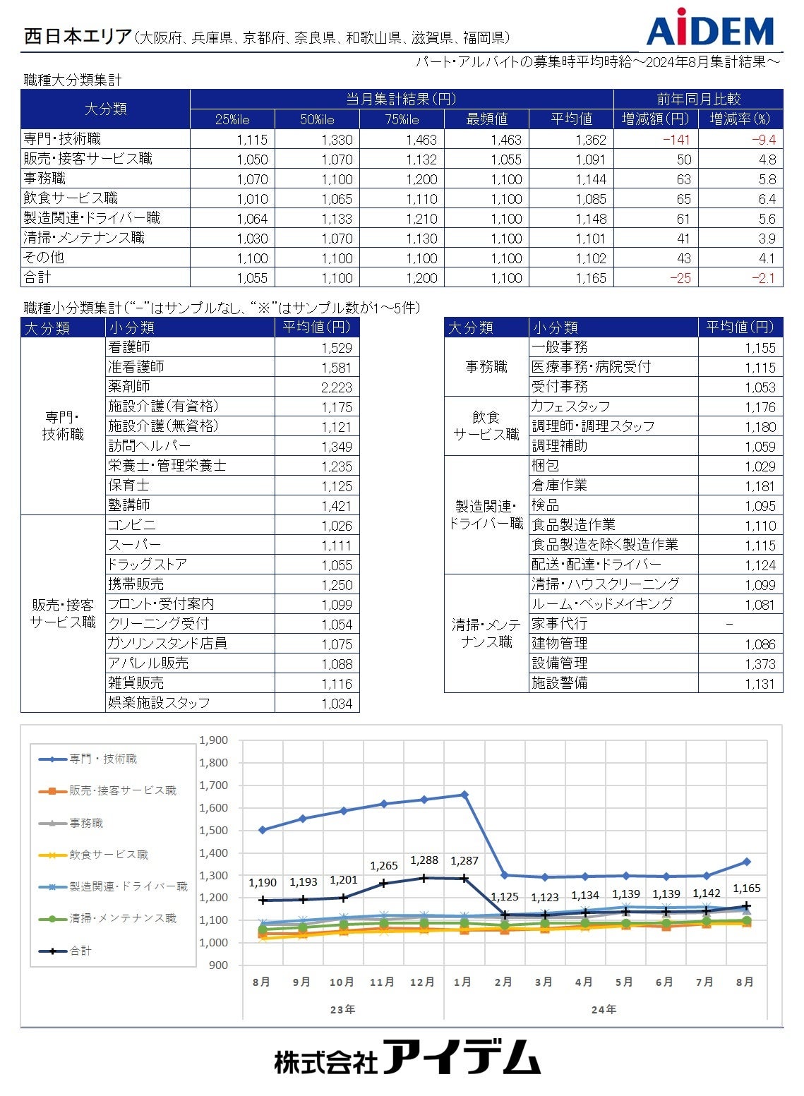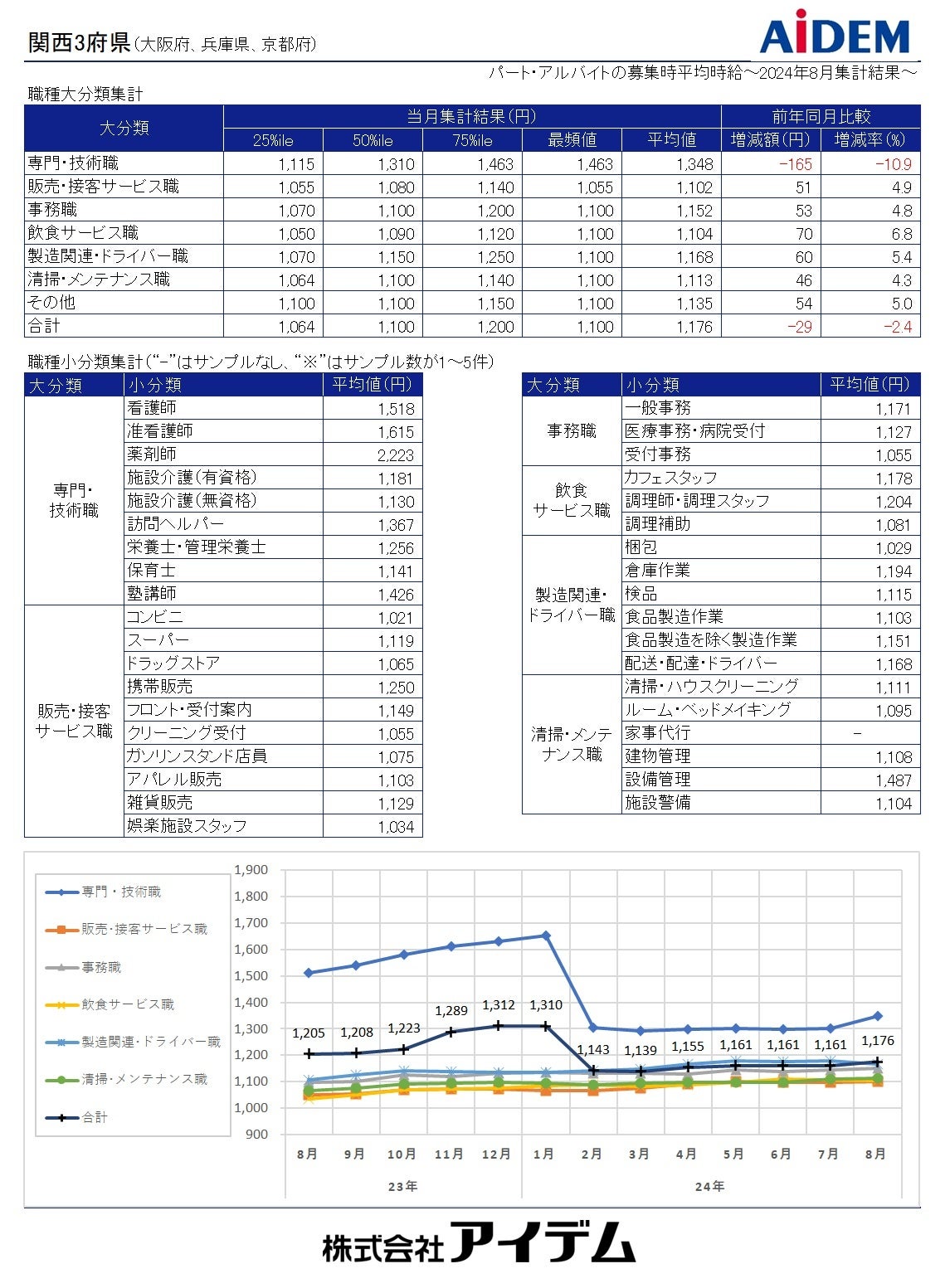 職種大分類別の平均時給は、「専門・技術職」1,348円(前年同月比165円減)、「製造関連・ドライバー職」1,168円(同60円増)、「事務職」1,152円(同53円増)、「清掃・メンテナンス職」1,113円(同46円増)、「飲食サービス職」1,104円(同70円増)、「販売・接客サービス職」1,102円(同51円増)の順で、前年同月比でプラスが5職種、マイナスが1職種となった。府県別の平均時給は、大阪府1,208円(前年同月比63円減)、兵庫県1,144円(同1円増)、京都府1,126円(同44円増)の順となり、前年同月比でプラスが2府県、マイナスが1府となった。