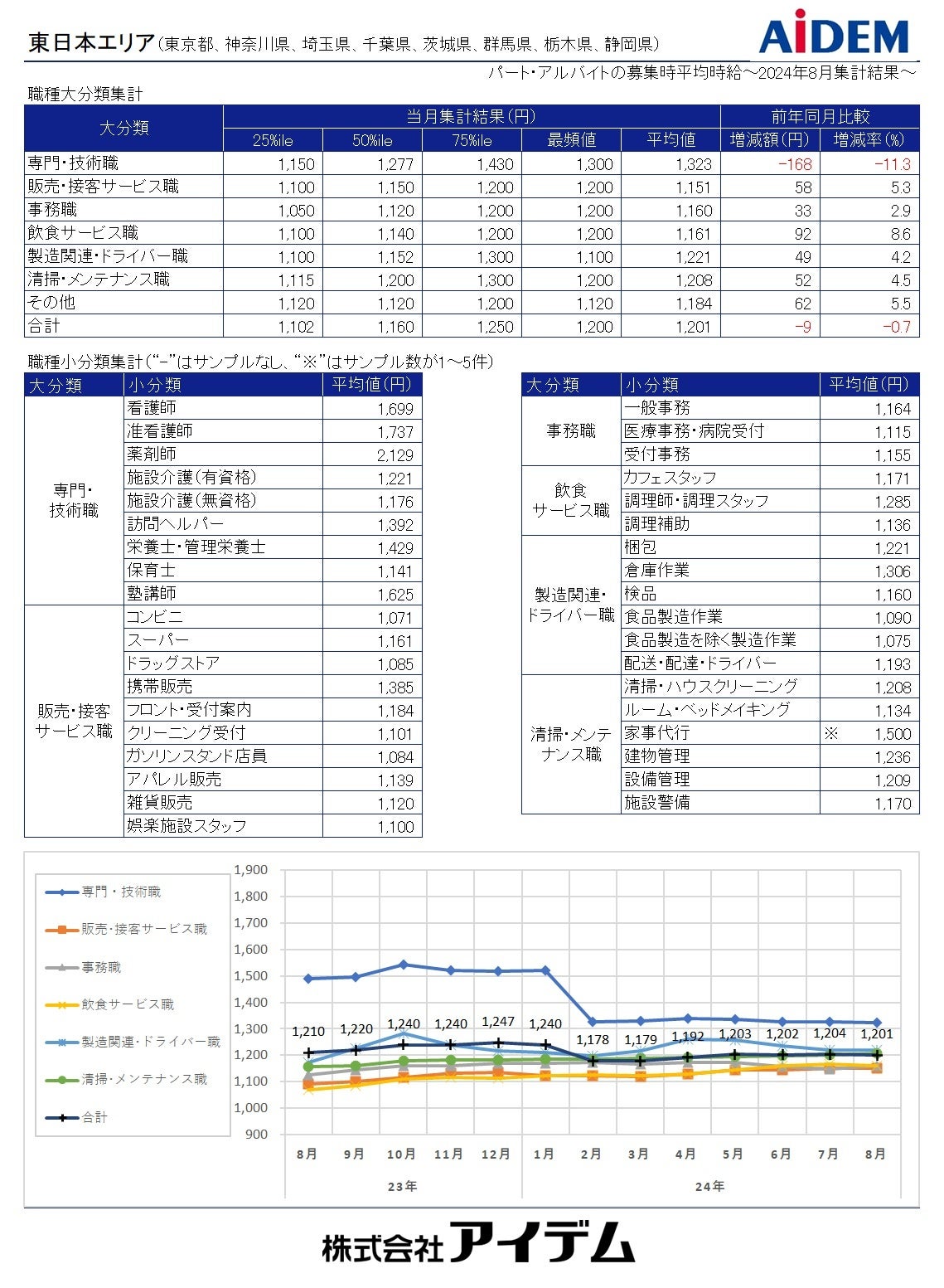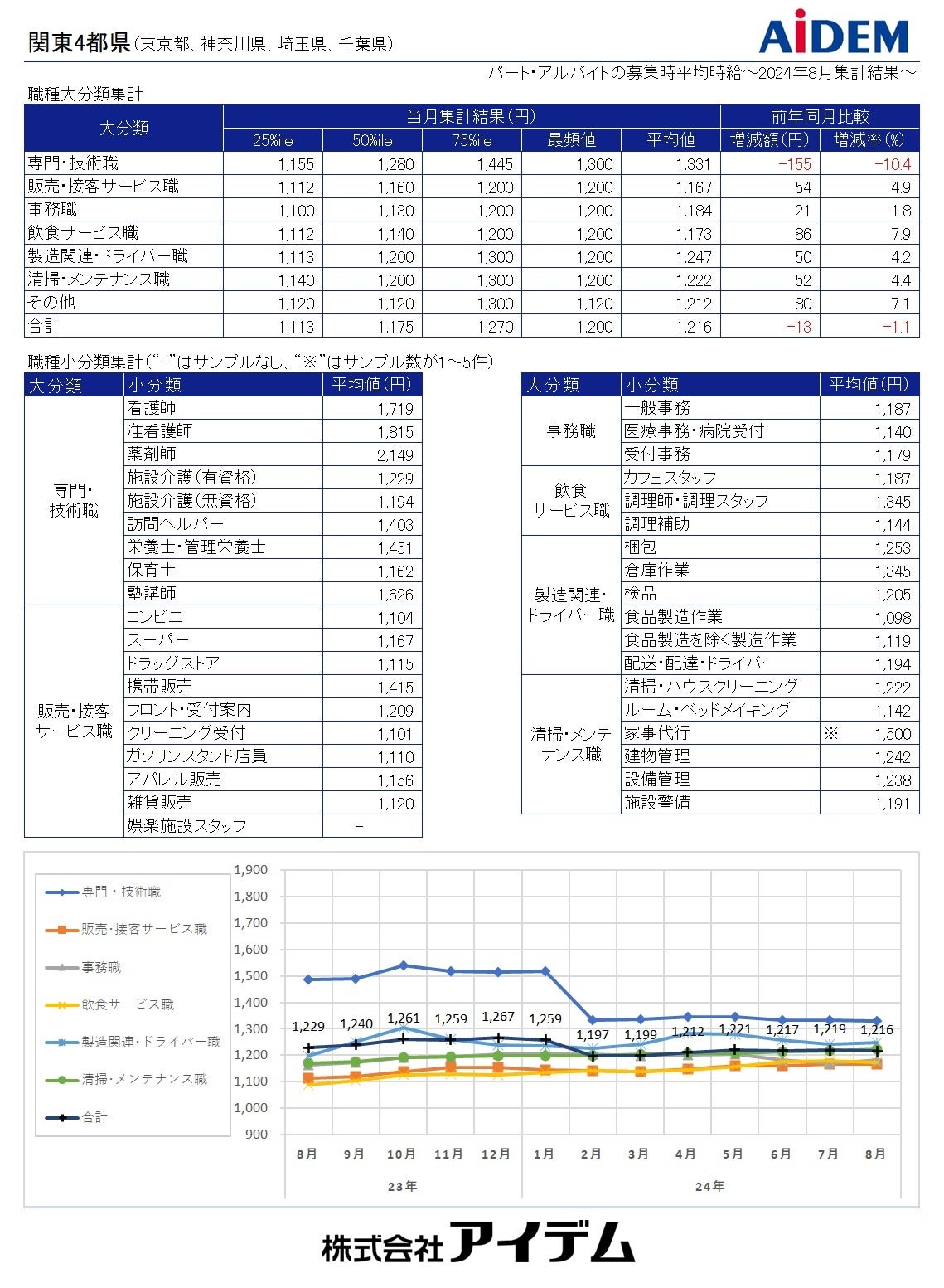職種大分類別の平均時給は、「専門・技術職」1,331円(前年同月比155円減)、「製造関連・ドライバー職」1,247円(同50円増)、「清掃・メンテナンス職」1,222円(同52円増)、「事務職」1,184円(同21円増)、「飲食サービス職」1,173円(同86円増)、「販売・接客サービス職」1,167円(同54円増)の順で、前年同月比でプラスが5職種、マイナスが1職種となった。都県別の平均時給は、東京都1,243円(前年同月比3円増)、神奈川県1,228円(同26円減)、埼玉県1,171円(同36円減)、千葉県1,166円(同25円減)の順となり、前年同月比でプラスが1都、マイナスが3県となった。