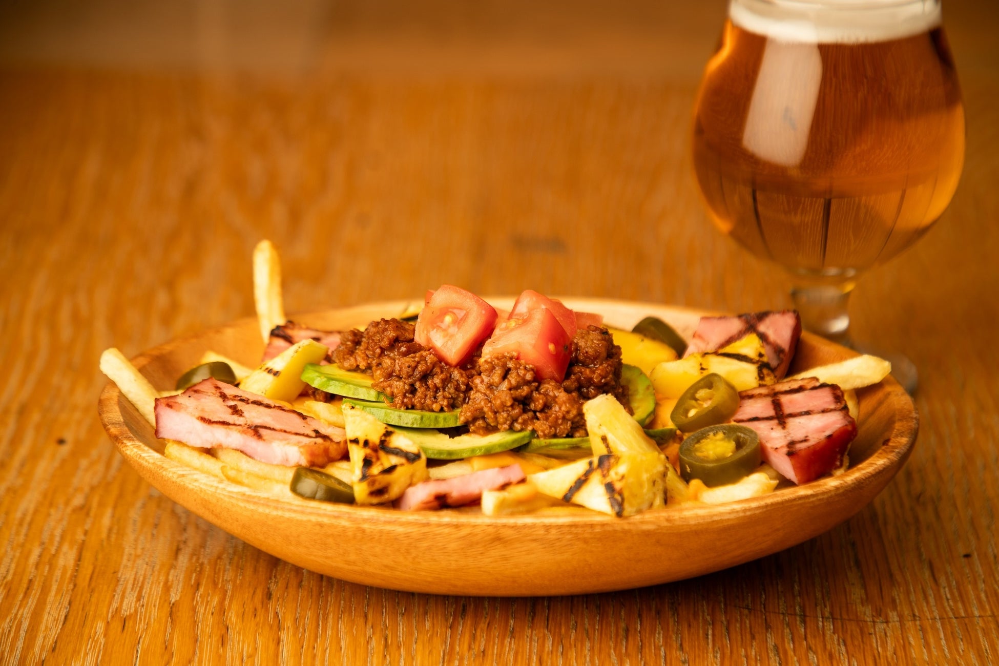 BBQハワイアンバーガーをイメージしたローディットポテト。ローディットポテトが生まれたハワイらしい豪快な仕上がり。 Light BEERとの相性も抜群な一皿。