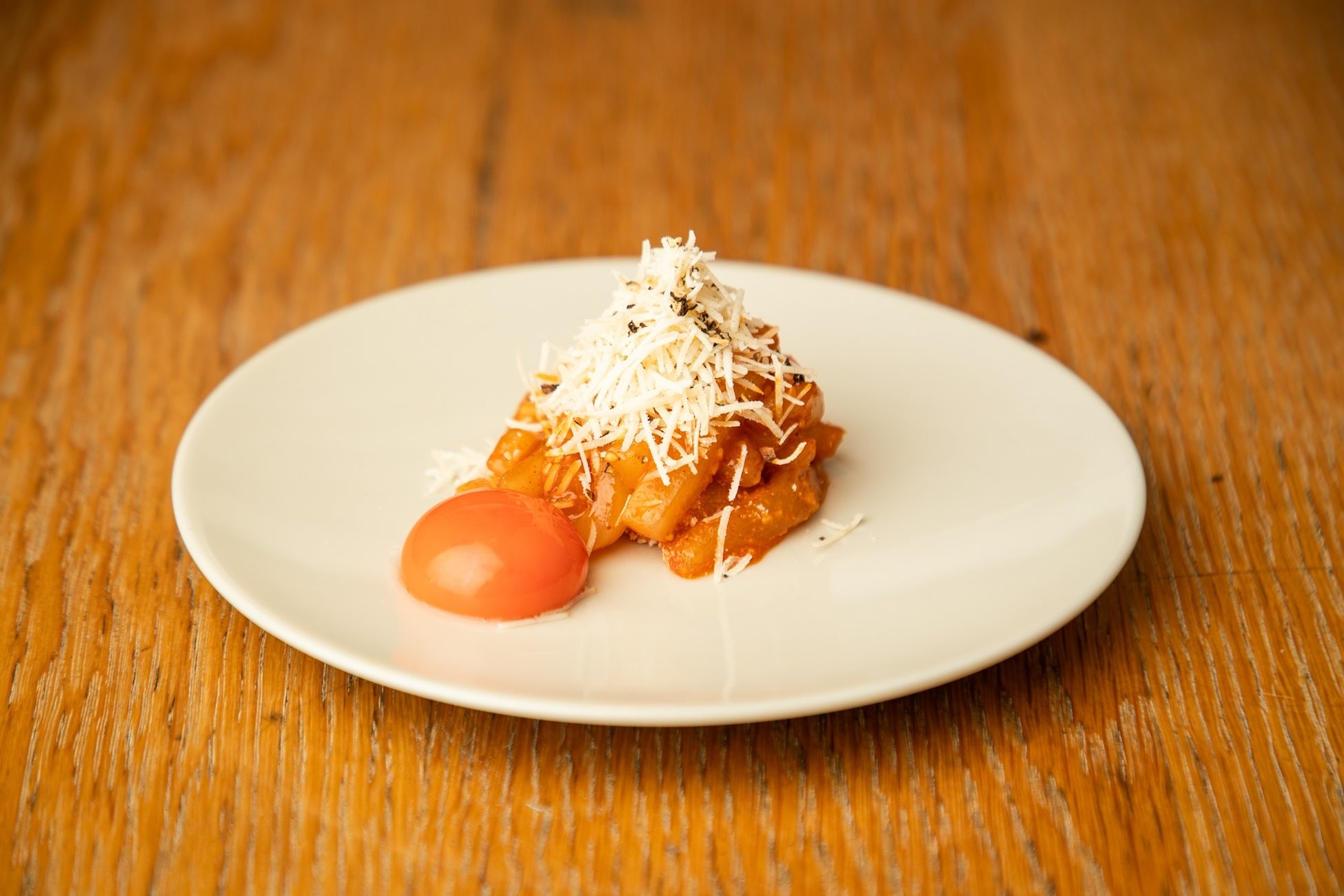 燻製の香りを付けたイカをユッケにしカルボナーラ風に仕上げ、一風変わったテクスチャーに。ねっとりとした燻製アカイカとチーズでビールが進む一品。