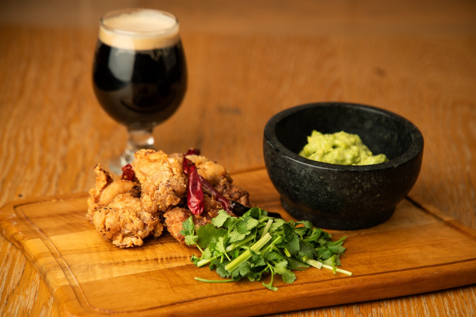 メキシコの定番料理ワカモレと中華料理のラーズーチー(鶏の辛唐揚)のプレート。辛みと酸味のマッチが楽しめるビールのおつまみとしてベストな一品。