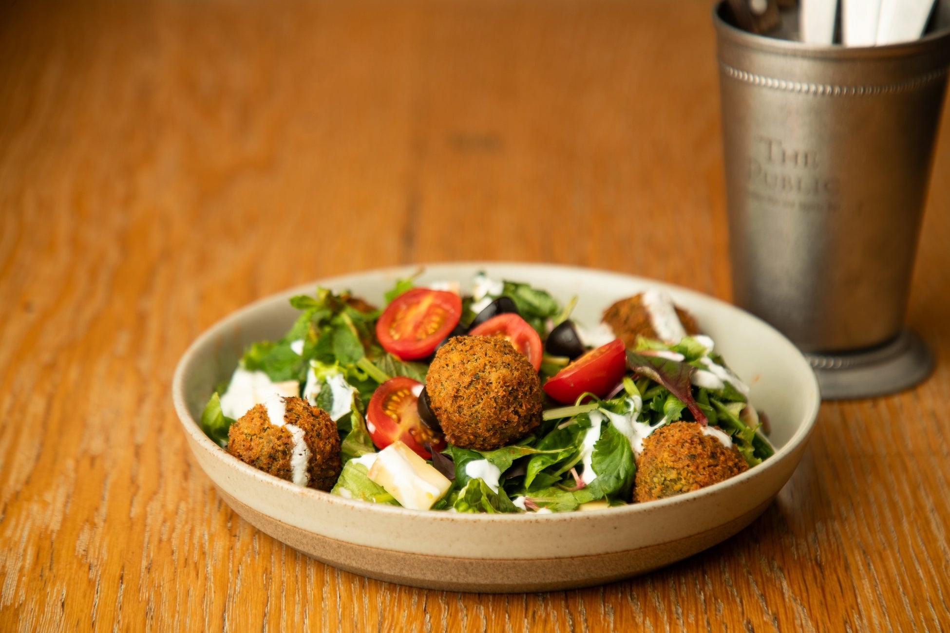 中近東発祥、ひよこ豆を使用したコロッケ”ファラフェル”をスパイシーに仕上げ、爽やかなハーブサラダと合わせました。シラチャー(タイ発祥のチリペースト)のドレッシングと、ウォッシュチーズのアクセントでビールが進む不思議なテイストに。