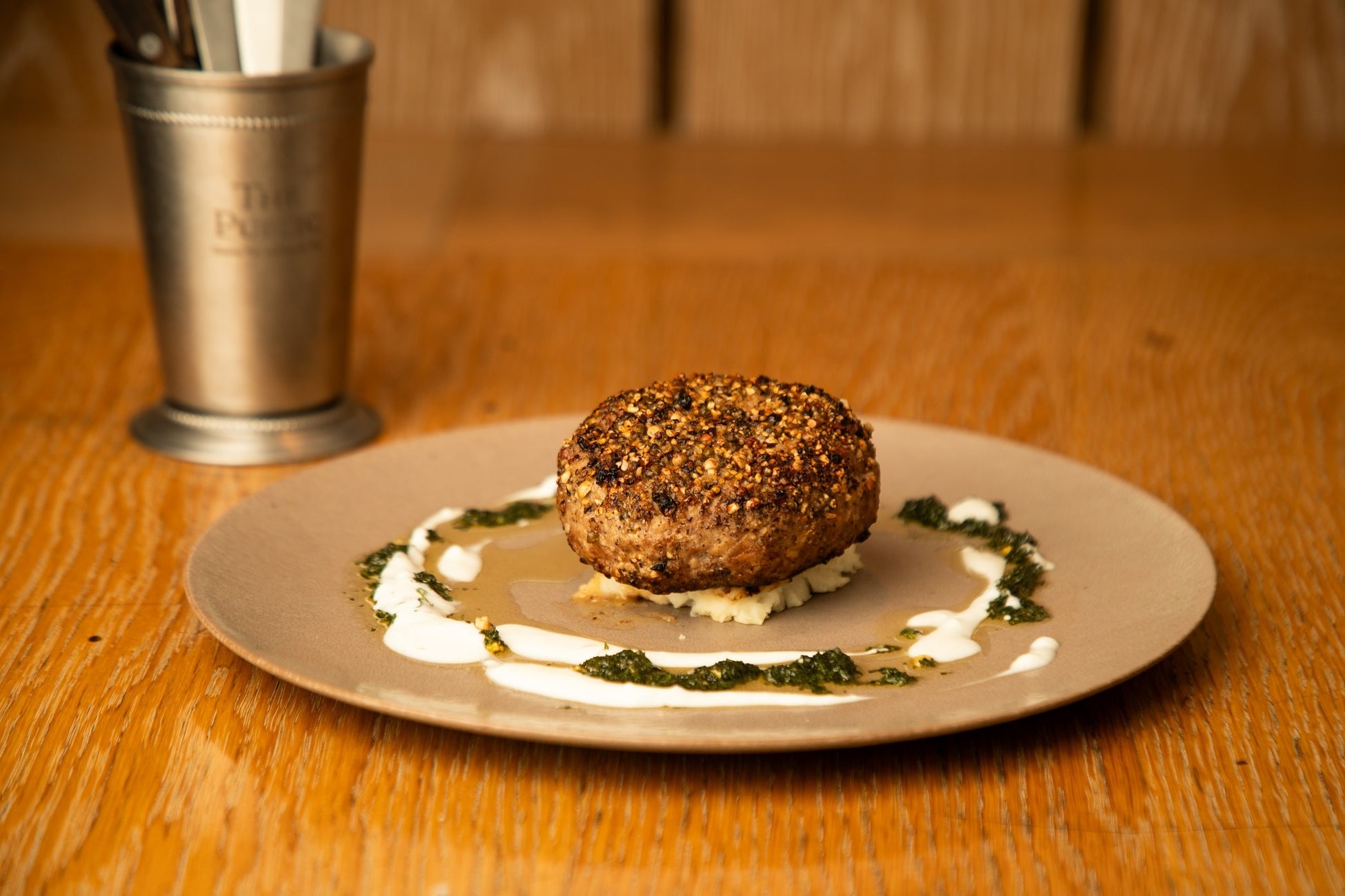 ジューシーな肉汁と香り豊かなラム肉を100%使用したハンバーグ。表面に3種のスパイスを付けてグリルし、酸味あるヨーグルトソースに爽やかな大葉のアクセントが効いた、暑い季節に食べたくなるペアリング料理。