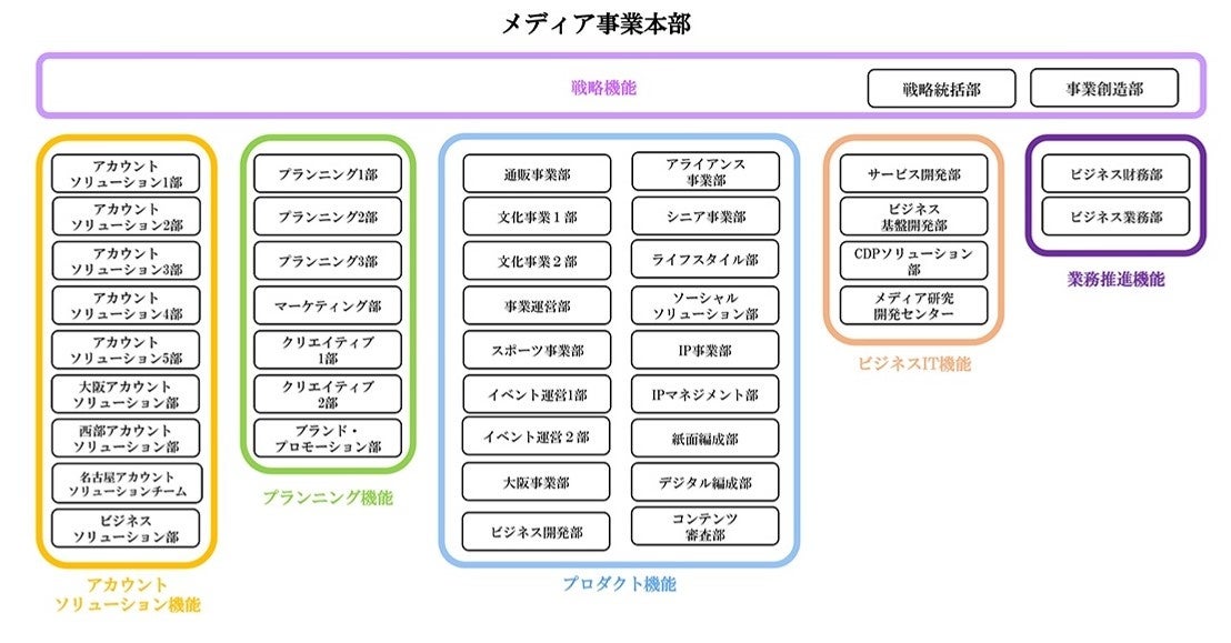 メディア事業本部は、朝日新聞社が提供するメディア、コンテンツ、イベント、サービスなどの商品を一元的に扱い、お客様に最適なソリューションを提供することを目的に、機能単位でシームレスに統合された一つの組織として運営します。当社のビジネス関連部門が持つ提供価値を集約した「アカウントソリューション」「プランニング」「プロダクト」「ビジネスIT」「業務推進」の各機能を「戦略」機能が統括し、一体的に運用していく体制となります。