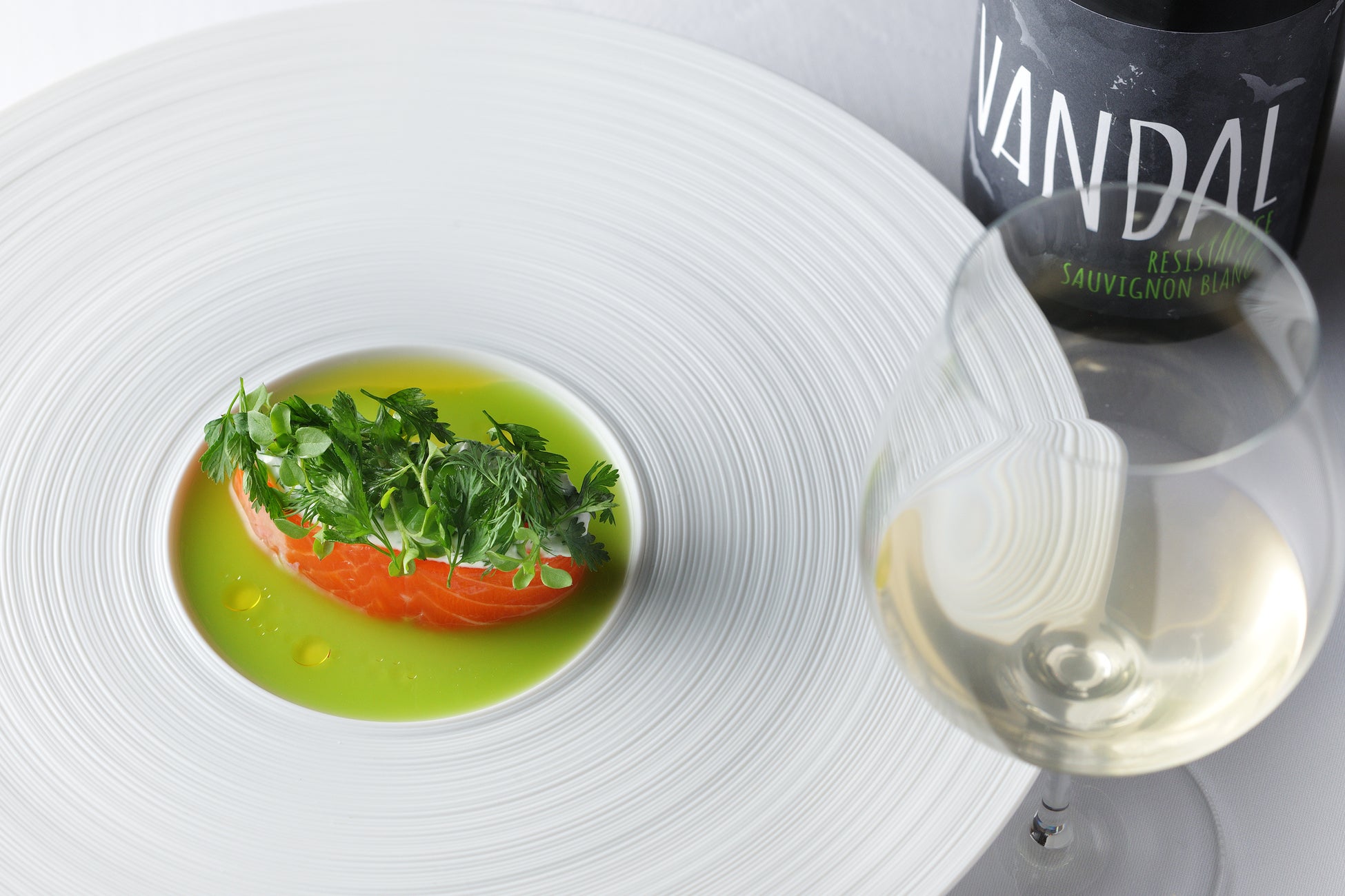 自然豊かな環境で育まれたサーモンと、青々とした旬のエンドウ豆を楽しむ一皿です。熟成サーモンのまろやかな旨みと、わさびを効かせたヨーグルトソースが織りなす爽やかな余韻を楽しめます。豆の歯ごたえ、ハーブの香り、酸味のあるソースが重なり合い、食べ進めるごとに食感と香りの変化を堪能できる春の一皿です。
