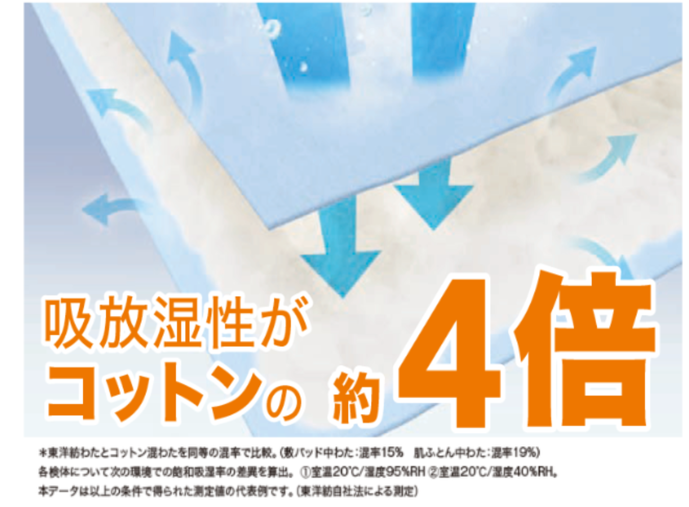 また、ムレを軽減する東洋紡の除湿わたを採用しています。寝ている間に湿気をコントロールし放湿してくれるので、ムレ感なく快適にご使用いただけます。