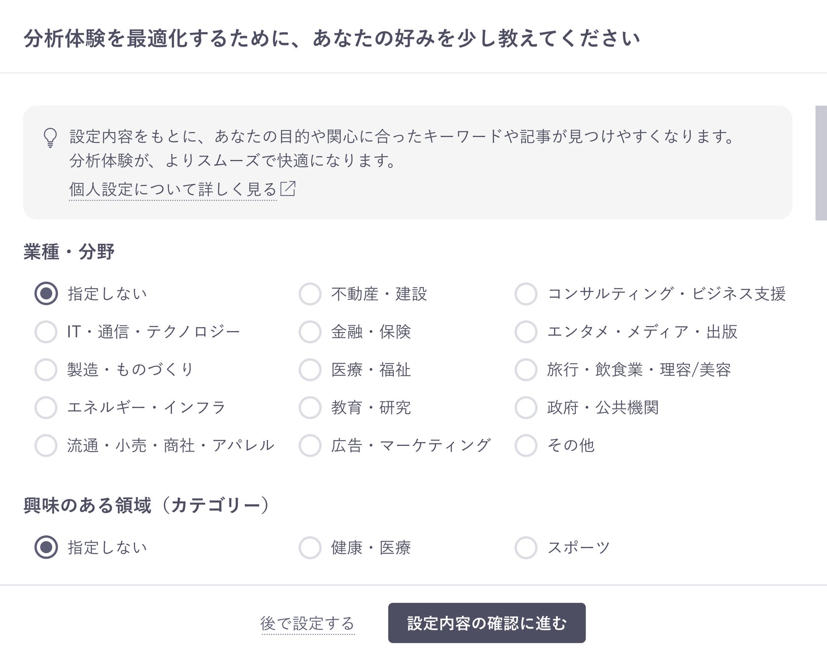 また、同日に提供を開始する「個人設定機能」は、業種・分野、興味のある領域、主な利用目的などを設定することで、ユーザーごとの目的や興味関心に合ったキーワードやトピックを見つけやすくなります。