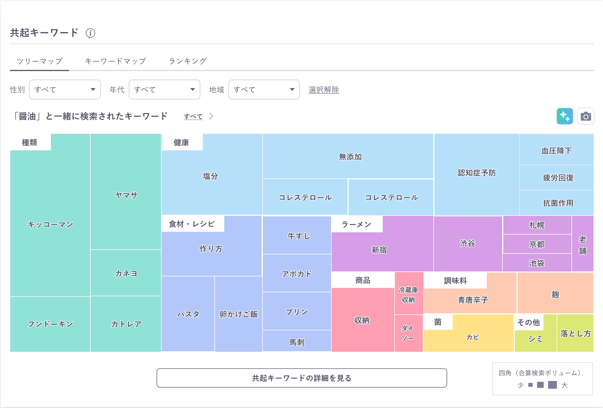 また「共起キーワード」では、ある特定のキーワードと一緒に検索されたキーワードについて、そのキーワードがどのようなカテゴリに分類されるかをツリーマップ形式で表示できるようになりました。これにより、従来の「どんなキーワードが一緒に検索されているか」に加えて、「一緒に検索されているキーワードのカテゴリ」やその検索ボリュームも一目でわかります。