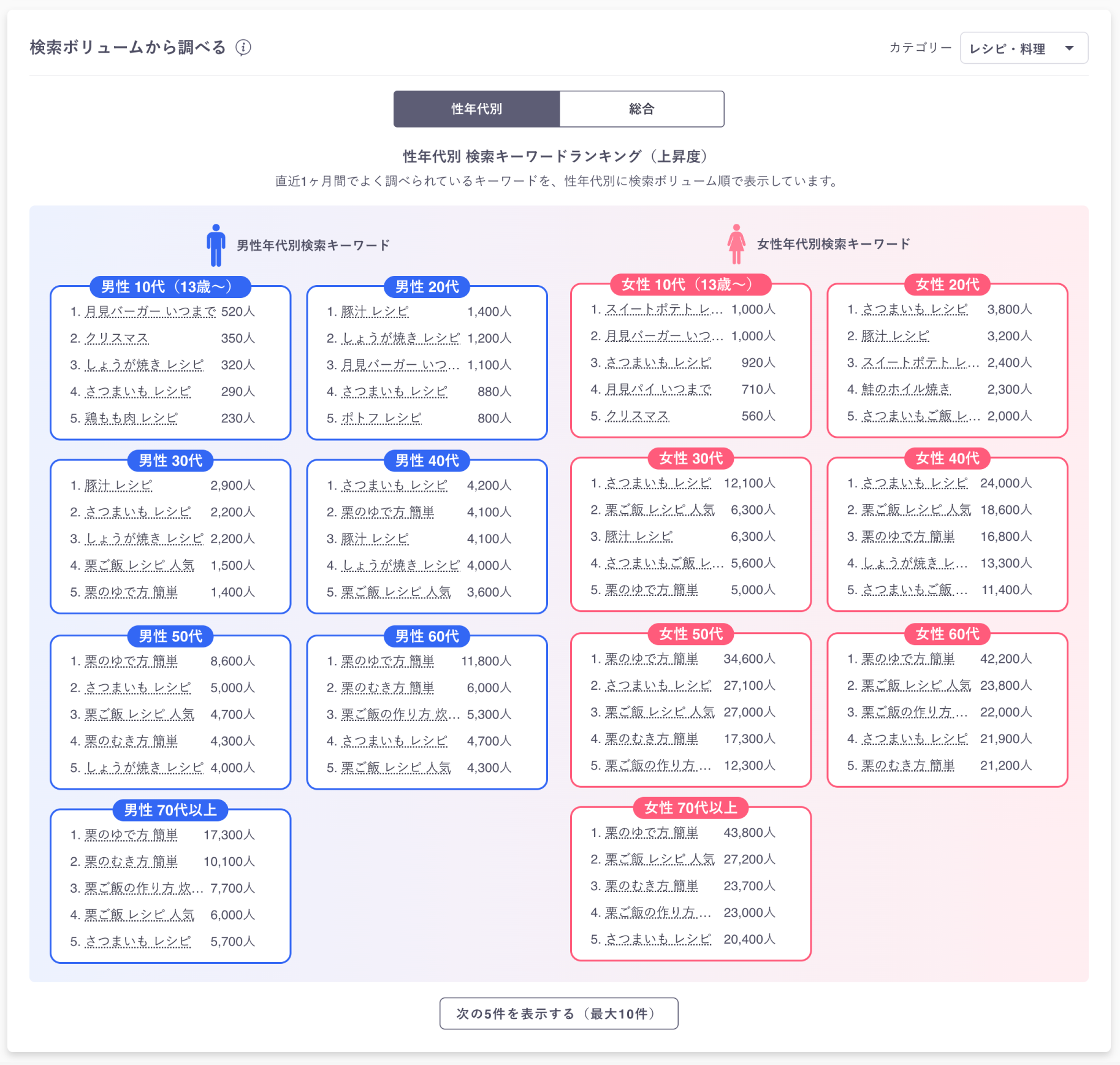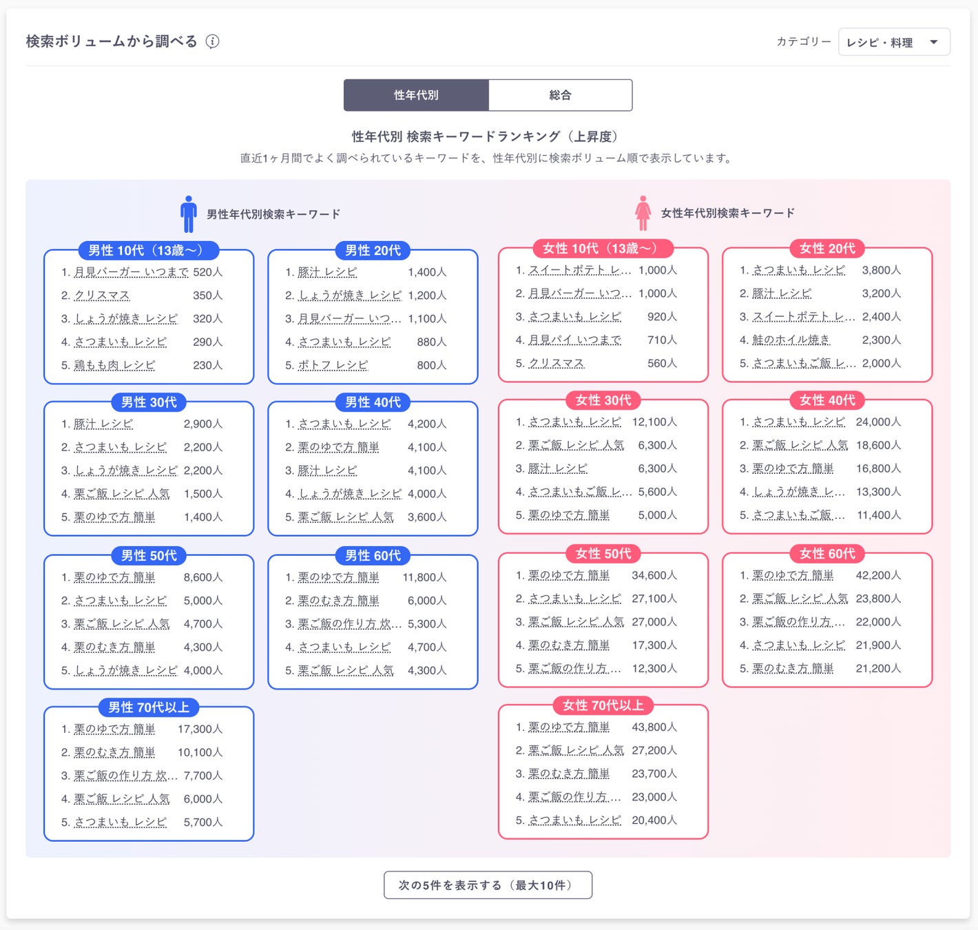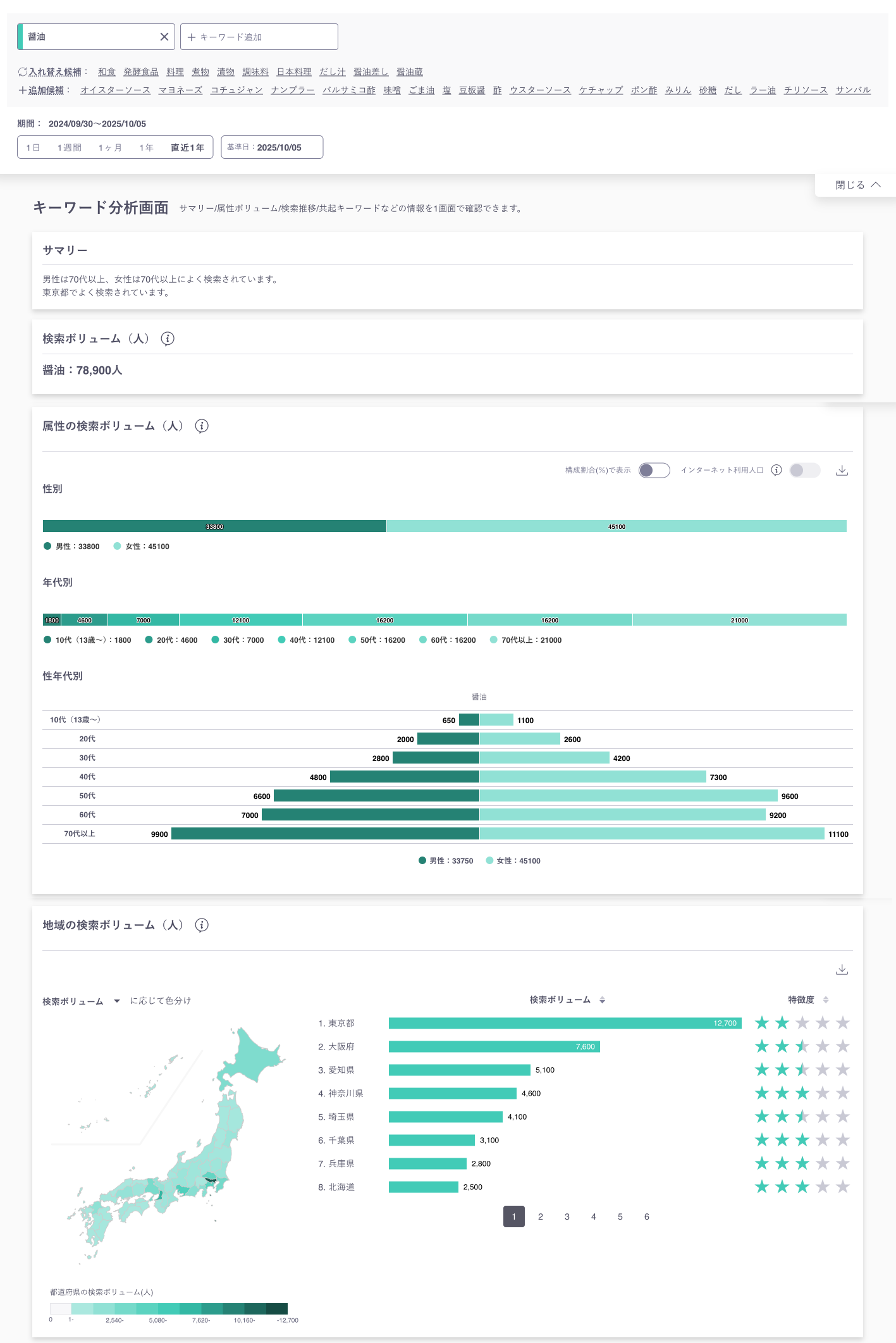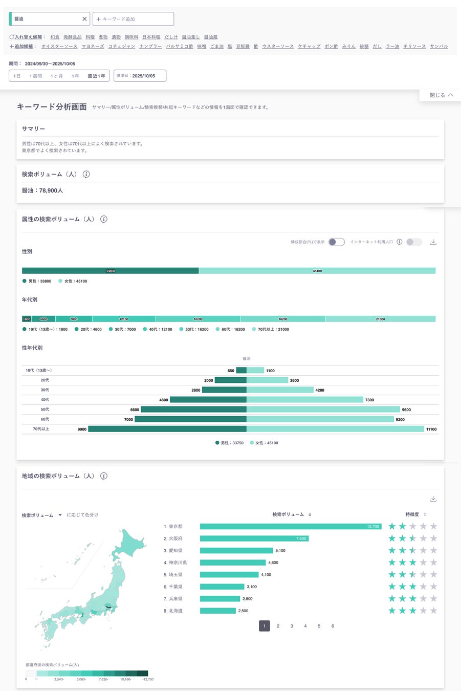 特定のキーワードに対し、性別・年代・地域など複数の観点から検索傾向を可視化します。豊富なグラフや分布図、ランキングにより、どのような人が、いつ、どんな興味関心をなぜ持っているのかを、これまで以上に把握しやすくなります。また、検索背景なども多様な切り口から分析できます。