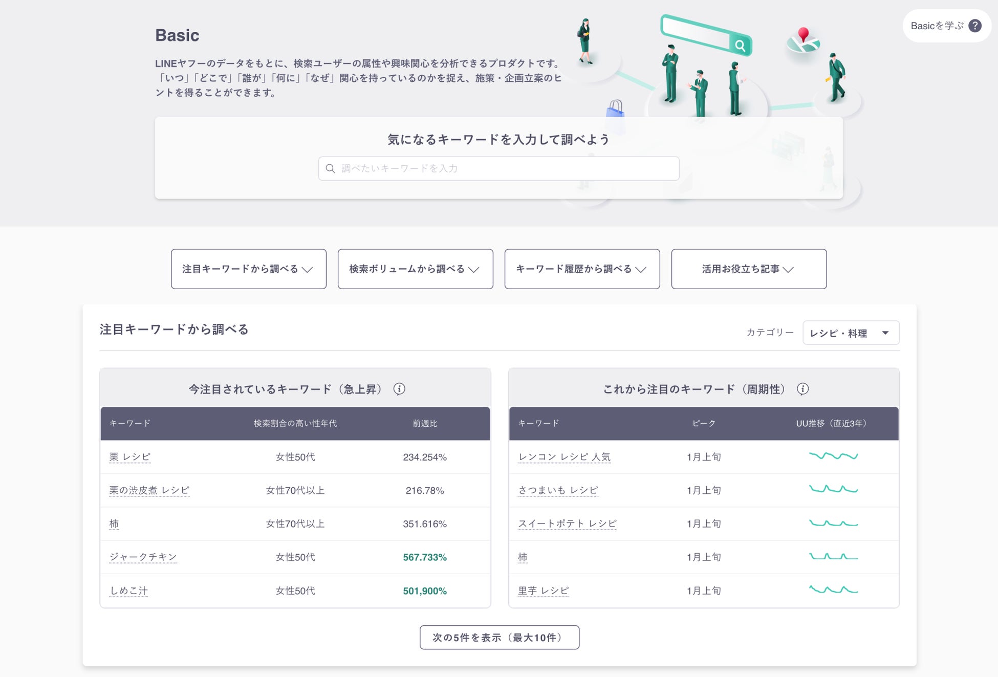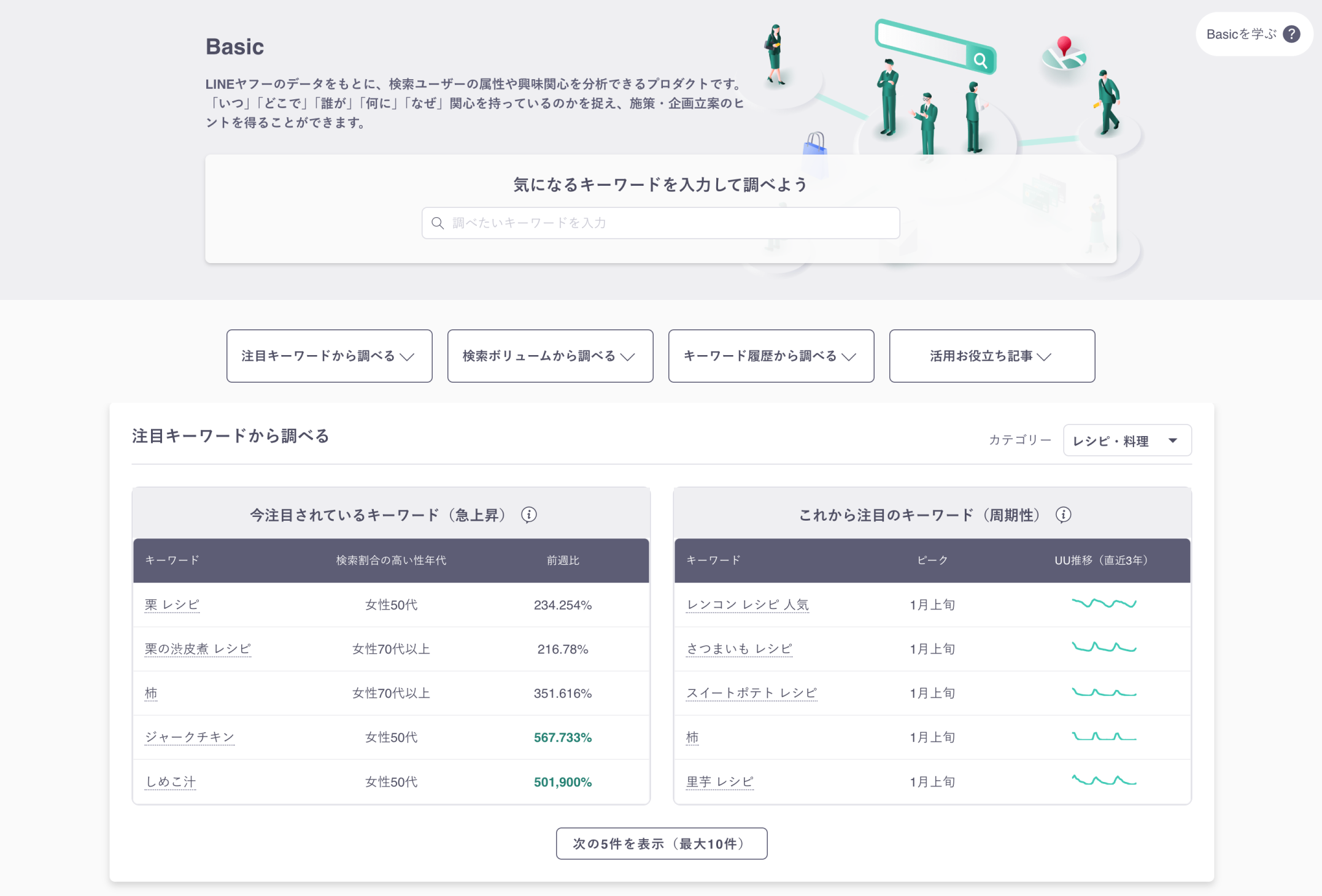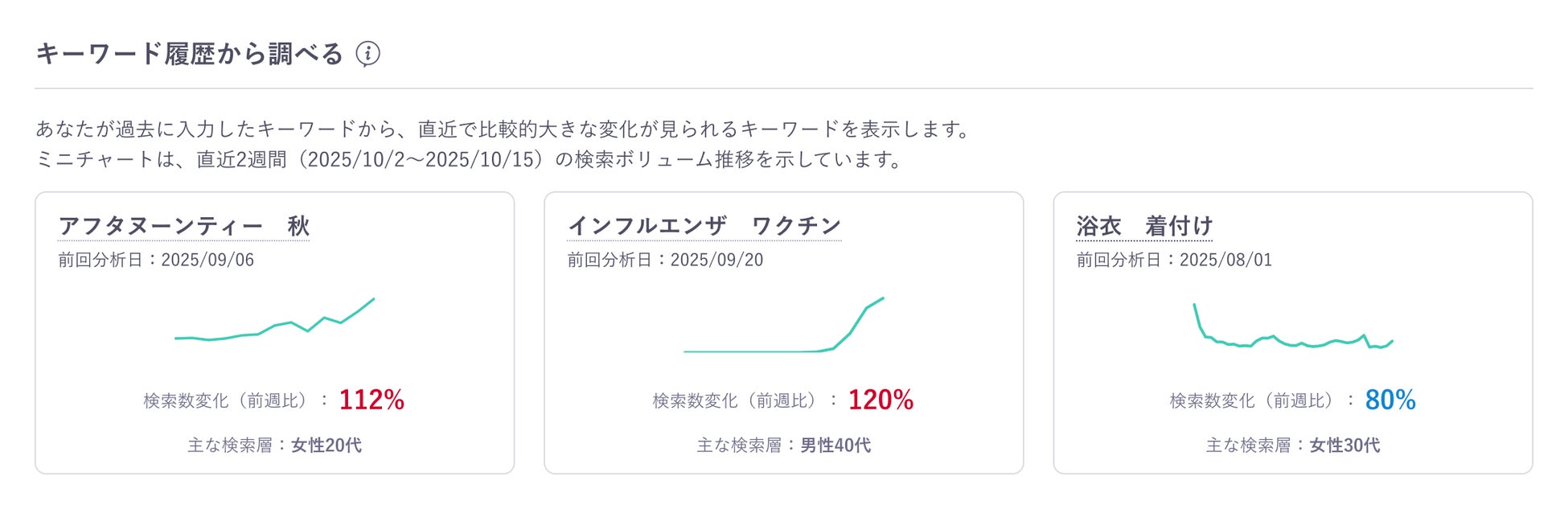 また、検索数が急上昇している注目のキーワードなどから探索できる「注目キーワードから調べる」、直近1ヶ月の性年代別の検索キーワードランキングから調べる「検索ボリュームから調べる」、過去に入力したキーワード履歴から見られる「キーワード履歴から調べる」などから、簡単に使い始められます。