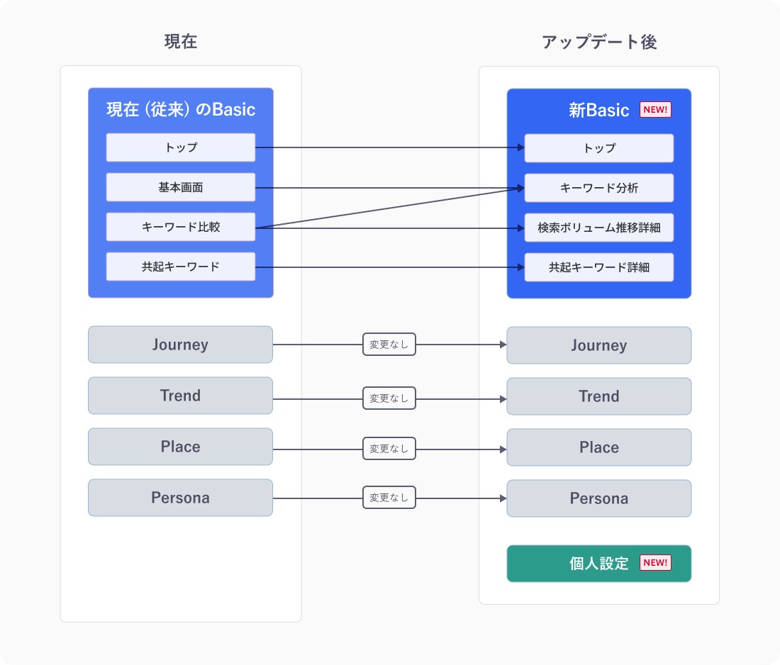 現在の「基本画面」と「キーワード比較」は、「キーワード分析」として統合され、新たに「検索ボリューム推移詳細」機能が登場します。また、「共起キーワード」を「共起キーワード詳細」として機能を拡張します。