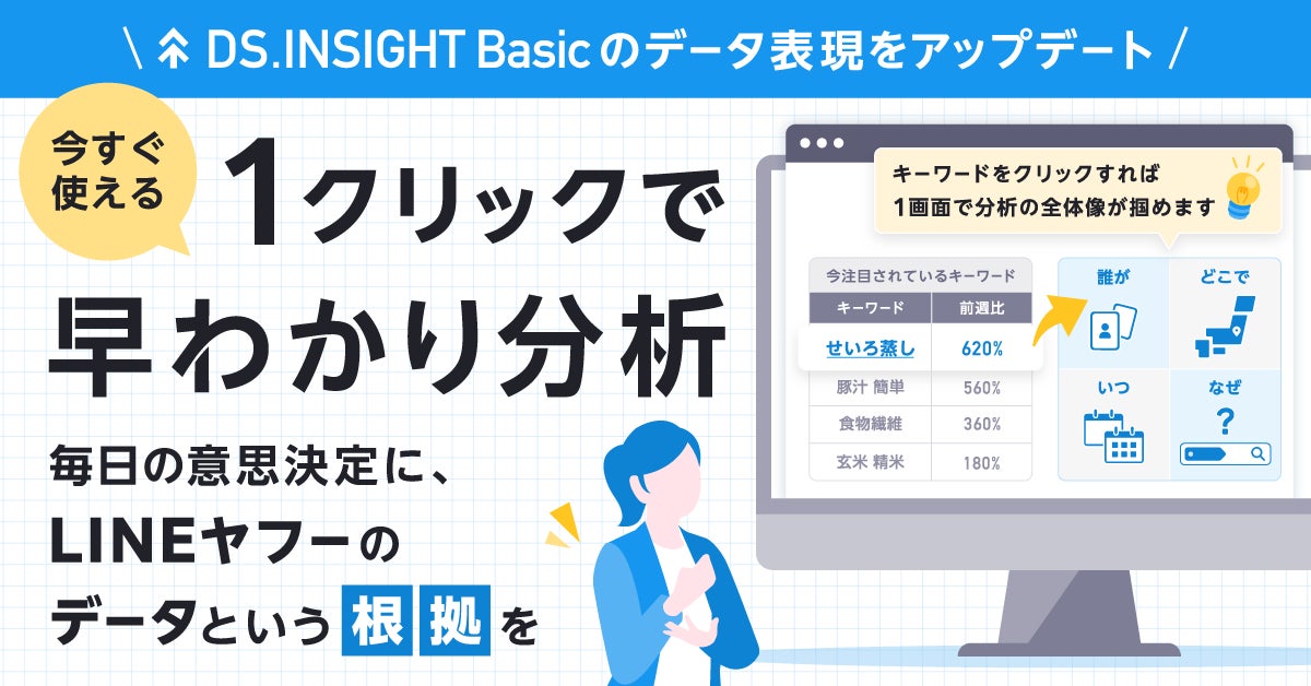 LINEヤフー株式会社(以下、LINEヤフー)が提供する、LINEヤフーの多様なサービスから得られるビッグデータを分析できる事業者向けサービス「ヤフー・データソリューション」は、検索・人流データから人々の興味・関心を分析できるデスクリサーチツール「DS.INSIGHT」において、11月13日(木)よりUI(ユーザーインターフェース)をアップデートします(以下、本アップデート)。このたびアップデートするのは、「DS.INSIGHT」内の、検索キーワードから人々の興味関心を分析できるプロダクト「DS.INSIGHT Basic」です。また、ユーザーの課題に合った分析体験ができる「個人設定機能」の提供も同時に開始します。