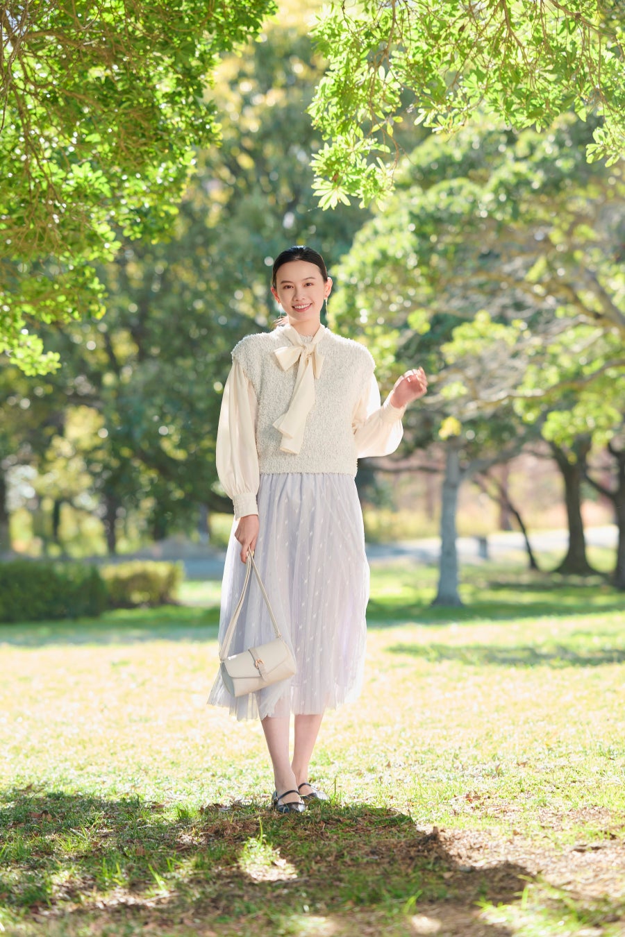 ニットベスト¥4,397/ブラウス¥4,947/スカート¥5,497/バッグ¥3,627/パンプス¥6,597/イヤリング¥2,197