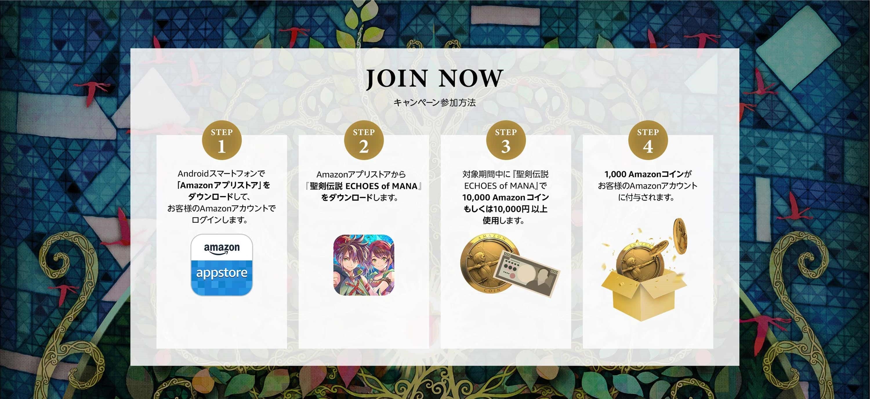 キャンペーン期間中、Amazonアプリストアの『聖剣伝説 ECHOES of MANA』で10,000円以上または10,000 Amazonコイン以上をご使用いただいた方を対象に、1,000 Amazonコインをプレゼントいたします。