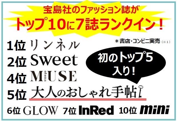 トップ10内には宝島社のファッション誌が7誌入り、2位『sweet(スウィート)』(118,594部)、4位『otona MUSE(オトナミューズ)』(103,708部)、5位は初のトップ5入りとなる『大人のおしゃれ手帖』(101,512部)、6位『GLOW(グロー)』(98,154部)、7位『InRed(インレッド)』(84,229部)、10位 『mini(ミニ)』(78,914部)となっています。ファッション誌の市場占有率は37%となり、12年連続でトップシェアを獲得しました。(※2) また、モノ雑誌『MonoMax(モノマックス)』(105,621部)が伸長率121%、美容誌『& ROSY(アンド ロージー)』(58,890部)が伸長率186%と好調を維持しています。(※3) 宝島社は、2010年以降に『リンネル』『GLOW』『otona MUSE』『大人のおしゃれ手帖』『& ROSY』『MonoMaster(モノマスター)』『素敵なあの人』の7誌を創刊。今後も雑誌出版のリーディングカンパニーとして、業界を盛り上げていくことに尽力してまいります。また、2021年12月には男女ファッション誌13誌合同のフェムテック啓発プロジェクト「もっと話そう! Hello Femtech(ハローフェムテック)」を始動。10~60代の幅広い世代に対して女性誌および男性誌を発行する強みを生かし、世代・性別の垣根を越えて情報を発信することで、女性の健康を取り巻く価値観のアップデートを目指してまいります。