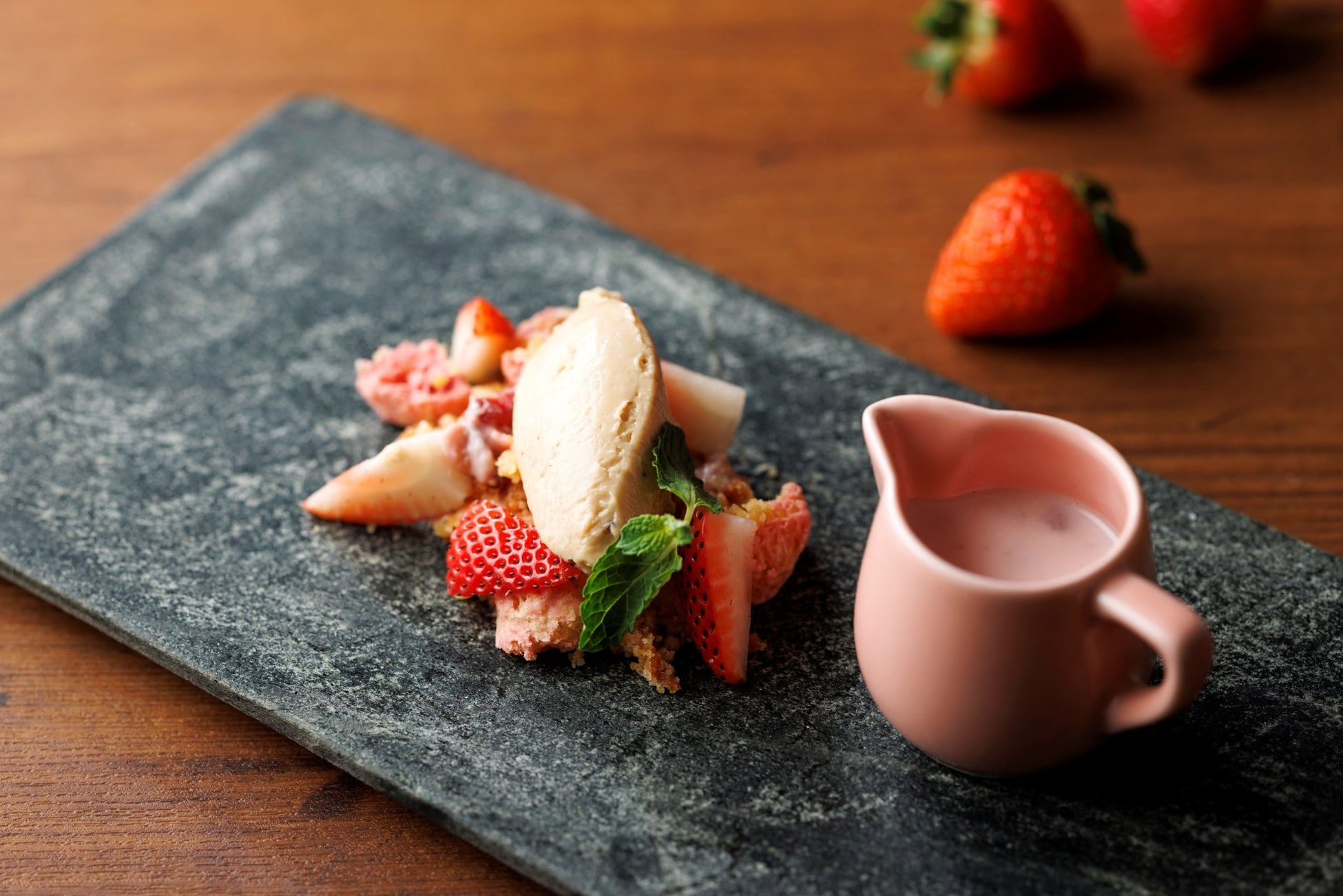 今回は、チョコレートのイメージが強い「カカオ」を料理に活用し、芳醇な香りや苦みなどカカオが持つ奥深い魅力をお楽しみいただける「カカオ料理」をご提供いたします。前菜には、みかんでマリネした鰤に、ハイカカオで蒸し煮をした大根を合せた一品をご用意。器にビーツとホワイトチョコレートのピューレを沈め、海老芋とクリームチーズのスープを静かに注いだポタージュは、ゆっくりとかき混ぜると色の変化も楽しめるシェフの遊び心光る一品。添えられた黒七味のクランブルパイをくずし入れると甘味ある濃厚な味わいにパイの食感と風味がよく合います。魚料理は、グリルした金目鯛に、ハイカカオを入れたソース、パン粉やカカオニブ、カカオマスを合わせて乾燥させたカカオミガス、ココアを入れて焼き上げたカカオチュイールをのせ、最後に削った柚子を散らせてご提供。金目鯛の上品な脂の甘みに、カカオの苦み、柚子の香りが絶妙に合わさった贅沢な一皿です。肉料理には、グリルした大阪産「能勢黒若牛」に、ポートワインと赤味噌、カカオ64%のチョコレートを合わせたソースを掛けてご提供。口に入れるとふんわりとカカオが香り、濃厚なソースが肉の旨味を引き立てます。デザートには、ストロベリーチョコレート入りのブレッドプティングをお楽しみいただきます。