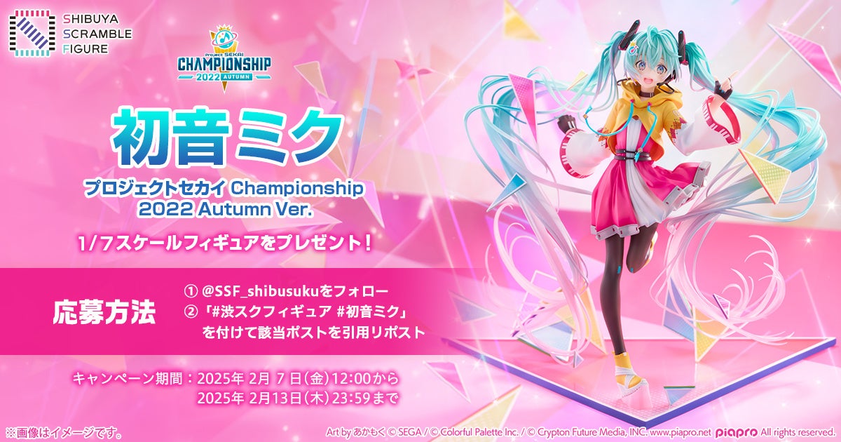 株式会社CyberZ(本社:東京都渋谷区、代表取締役社長:山内隆裕)が手掛けるフィギュアブランド「SHIBUYA SCRAMBLE FIGURE」(通称「渋スクフィギュア」)は、イラストレーターあかもく氏が書き下ろした『プロジェクトセカイ Championship 2022 Autumn』のメインビジュアルより、「初音ミク -プロジェクトセカイ Championship 2022 Autumn Ver.-」の予約受付を、本日2025年2月7日(金)より開始いたします。予約受付開始を記念して、抽選で3名様に「初音ミク -プロジェクトセカイ Championship 2022 Autumn Ver.-」が当たるプレゼントキャンペーンを開催いたします。