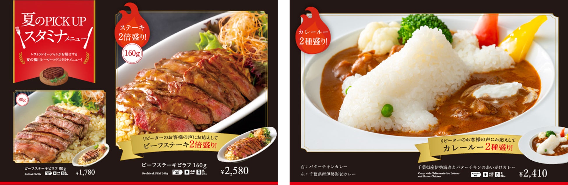 レストラン「OCEAN」は、海をコンセプトにした美しい内観と、四季折々のメニューから本格的なコース料理まで多彩な「食」を楽しむことができる人気のレストランです。6月1日(土)から提供を開始するのは、スタミナメニューとしてリピーターの声にお応えした肉2倍盛りの「ビーステーキピラフ」をはじめ、可愛くて食べられない定番の「シャチライス」が2種類のルー(伊勢海老カレー&バターチキンカレー)を纏って登場します。また、房州ひじきを使用した「房州ひじきと小エビのビスク&バジルパスタ」など、南房総の味を堪能できるメニューもご用意しました。