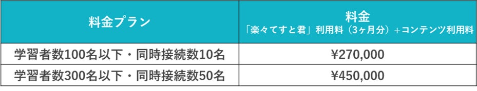 ※ ご利用料金には、「楽々てすと君」利用料(3ヶ月分)+コンテンツ利用料が含まれています。
