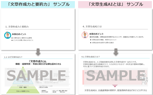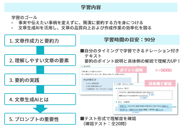 「要約力と文章生成AI活用ガイド」は、報告書やプレゼン資料の作成などビジネスシーンで求められる要約力と、文章生成AIを活用する際のポイントを理解し、文章作成における効率化や品質向上につなげる知識を習得することができるeラーニングコンテンツです。文章作成や文章生成AI活用のノウハウを、学習・テスト・アンケートが1つになったクラウド型eラーニングシステム「楽々てすと君」※1を使用して提供します。