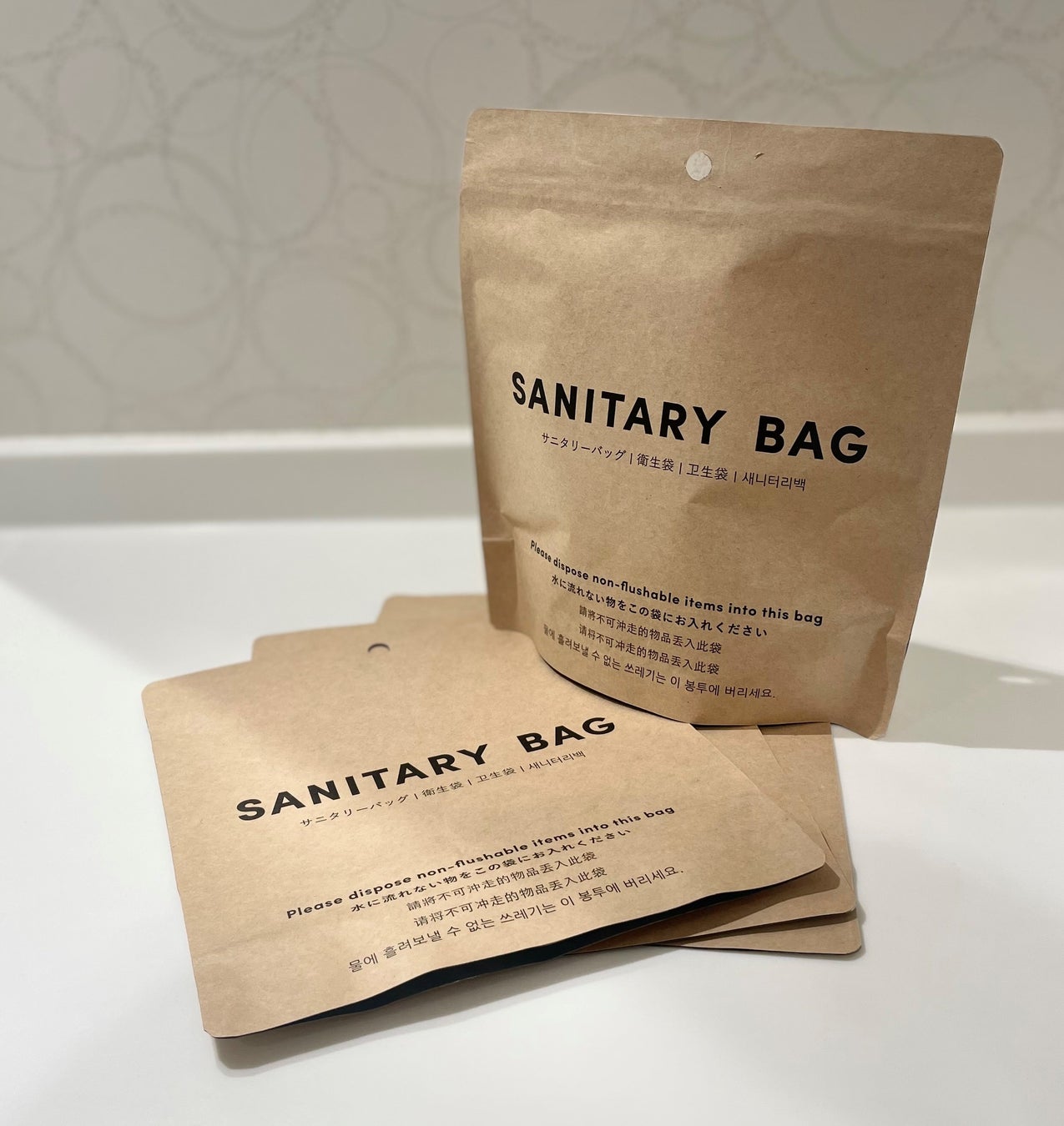今回のサニタリーバッグ改善にあたっては「株式会社シェルパック」が提供するサニタリーバッグ『Sunny』をヒントに開発を進めてまいりました。同社は主に食品パッケージを製造していますが、捨てられてしまう規格外の袋を活用できないかという思いから、規格外の袋をサニタリーバッグへ転用して販売しています。今回当ホテルで使用するものは製造ロット上新規製造されますが、製造ロスによる資源のムダをなくしたいという同社の想いに共感し、従来のような印刷擦れなどによる廃棄は行わない方針にしています。