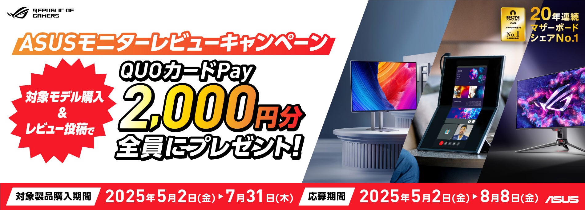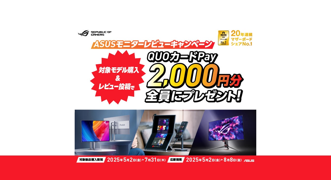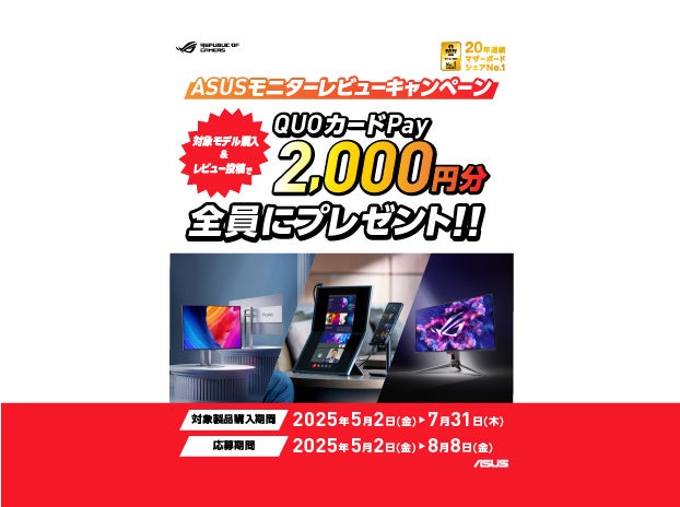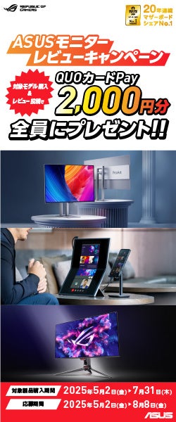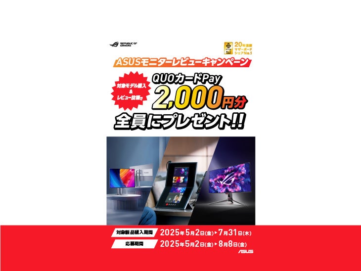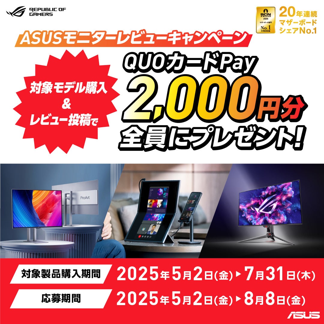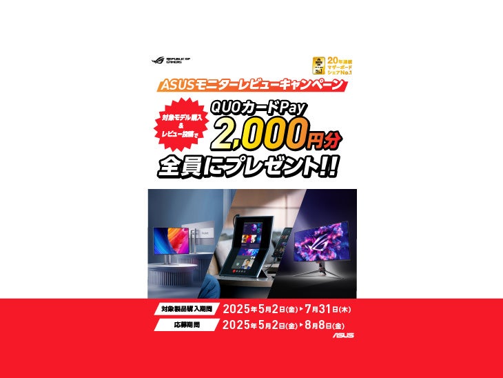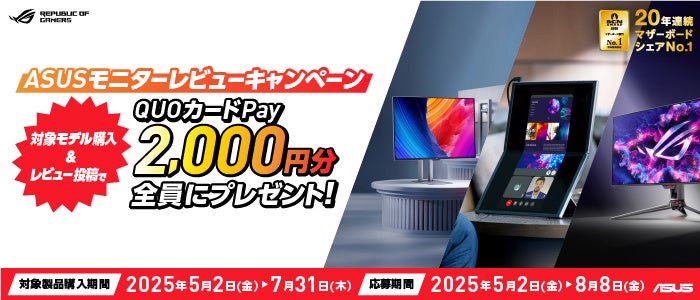 ASUS JAPAN株式会社はASUSの対象モニターを購入して、レビューを投稿すると2,000円のQUOカードPayがもらえるキャンペーンを発表しました。