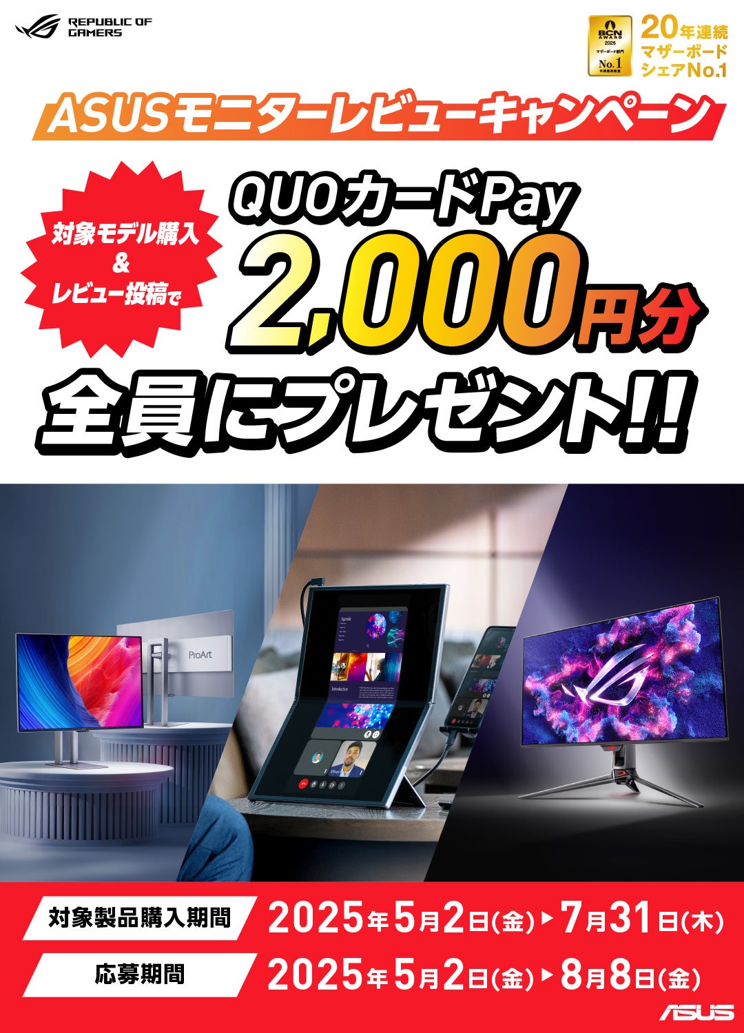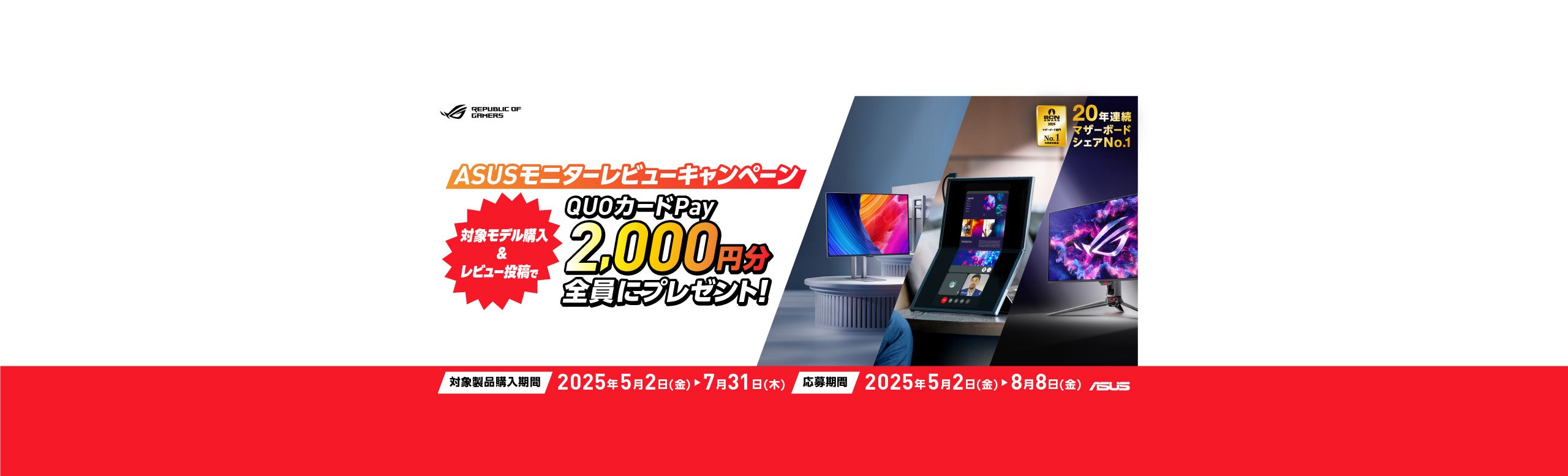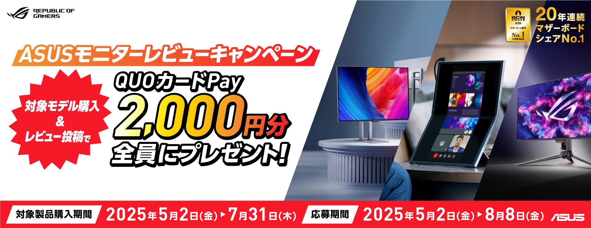 キャンペーン期間内に対象のASUSのモニターを購入し、レビュー投稿後特設サイトにてご応募いただくと、2,000円のQUOカードPayをプレゼントします。